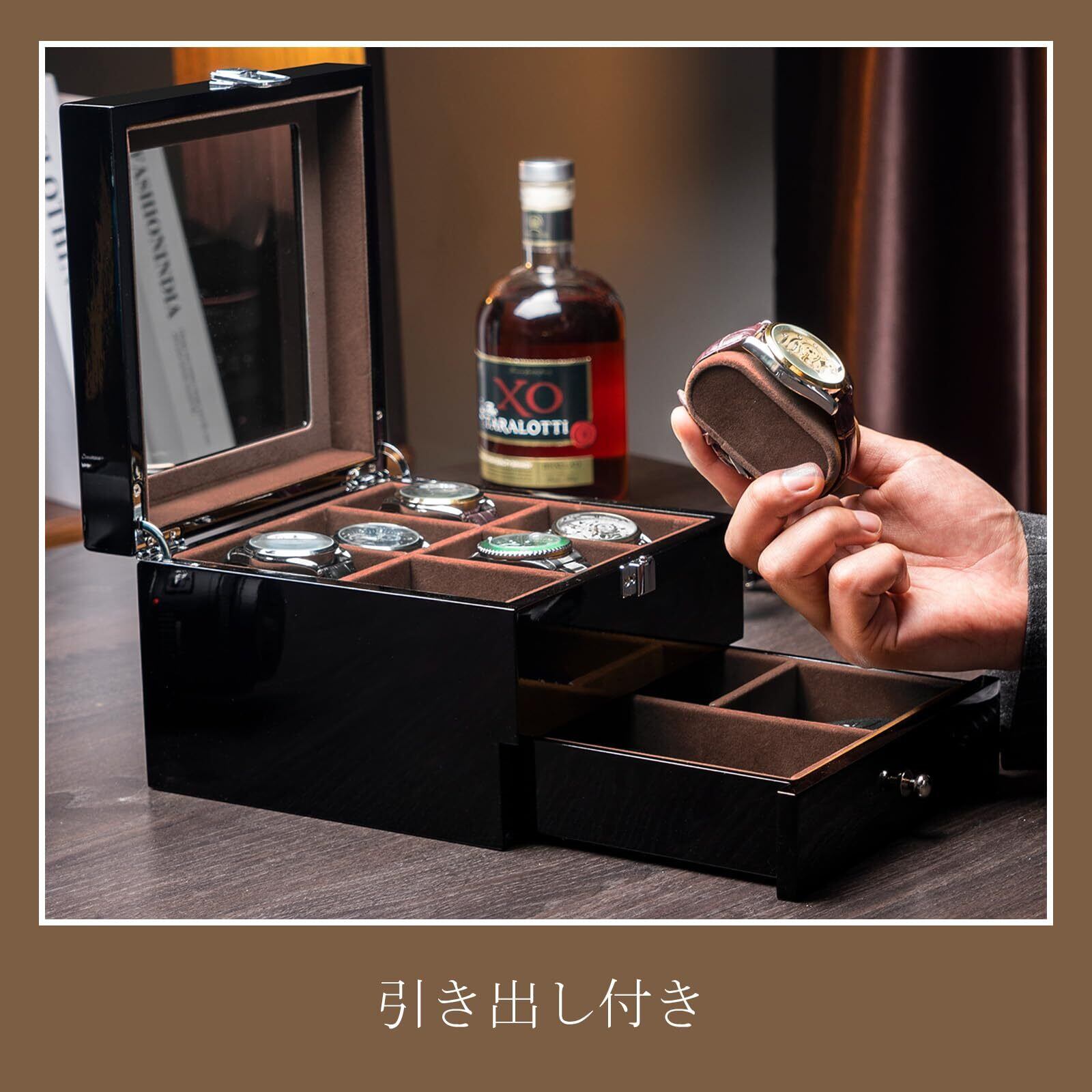 引き出し付きの二層式ウォッチボックスは、その他の小物を収納するスペースも豊富です。丈夫なガラス窓が時計を美しく見せます。