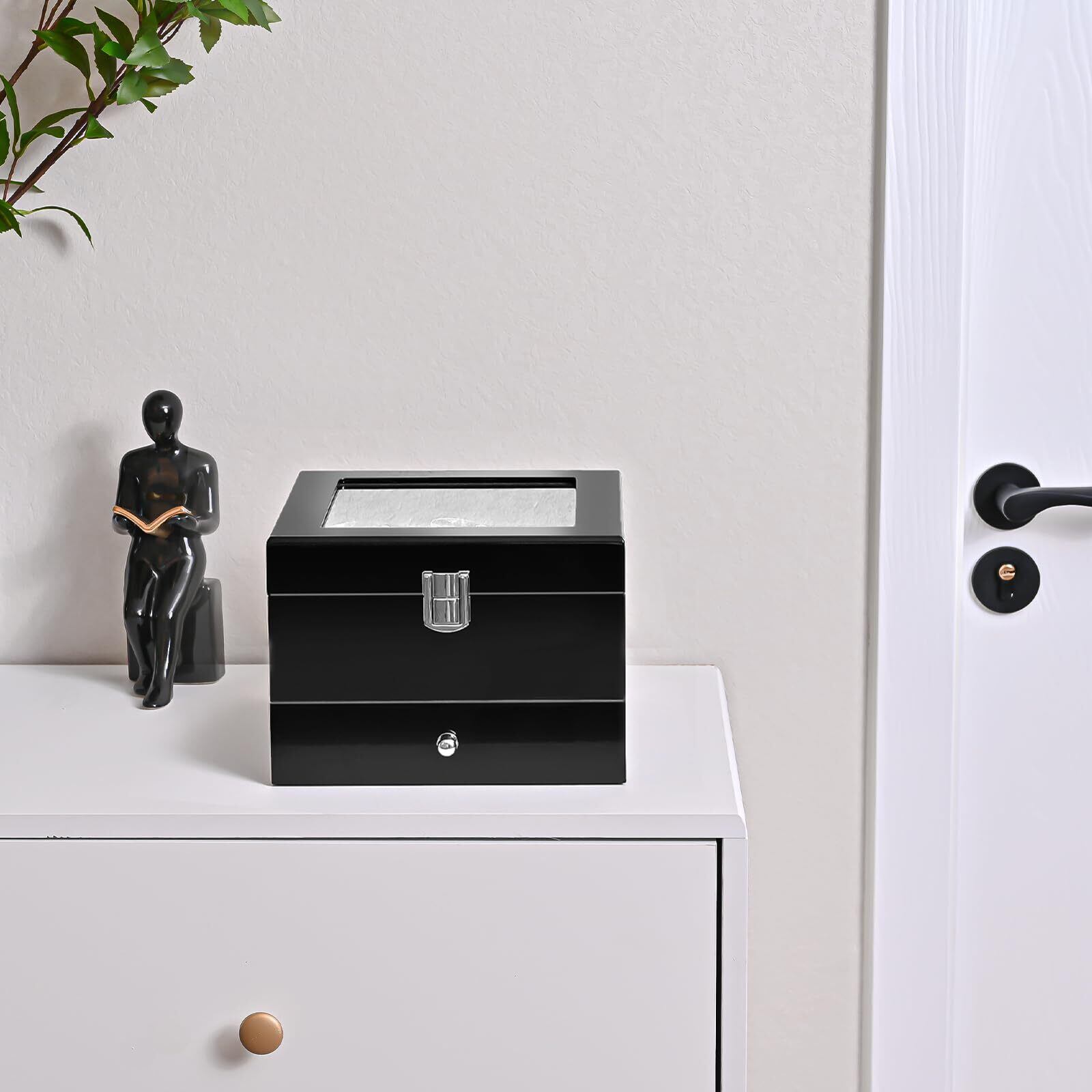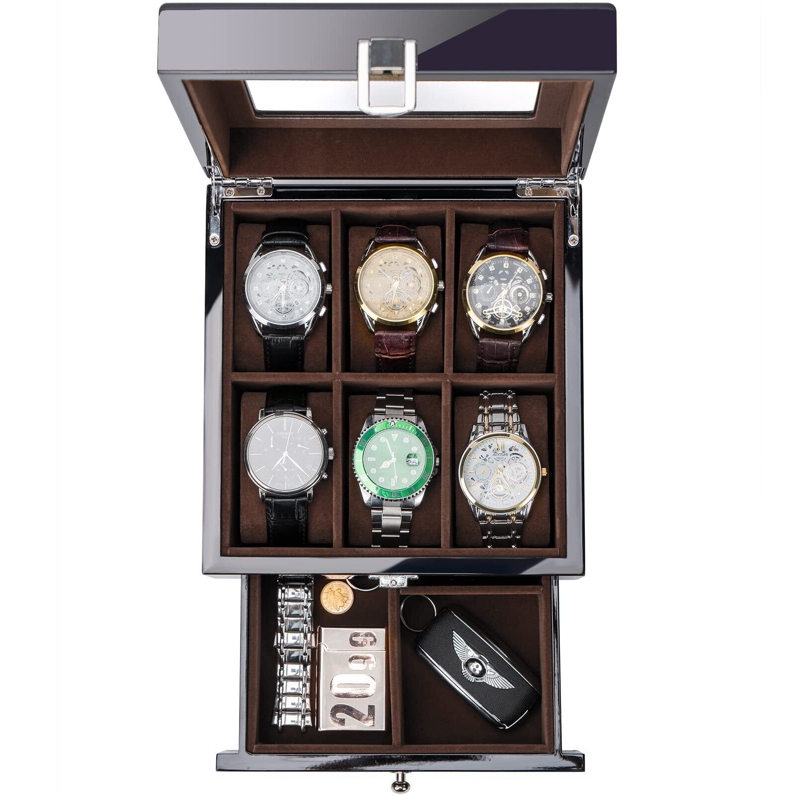 ProCase メンズ木製腕時計ボックス 6スロット ラッカー仕上げ ガラストップ付き 2段ディスプレイケース 父の日ギフト(ブラック)
