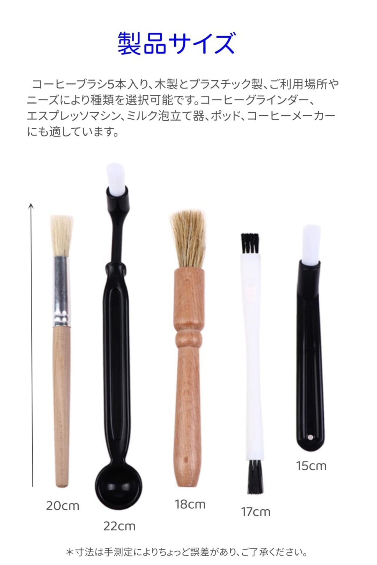 【製品仕様】コーヒーブラシ5本入り、木製とプラスチック製、ご利用場所やニーズにより種類を選択可能です。コーヒーグラインダー、エスプレッソマシン、ミルク泡立て器、ポッド、コーヒーメーカーにも適しています。