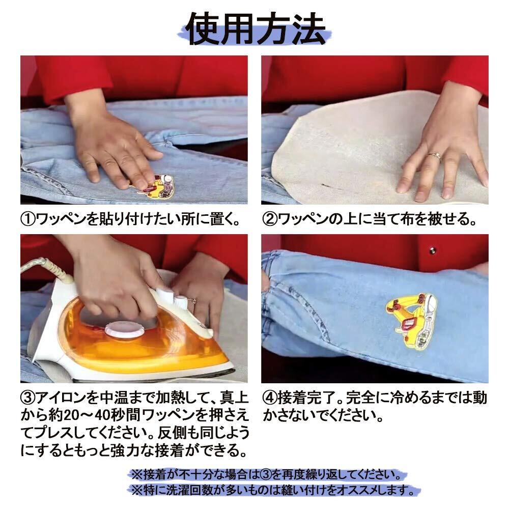 使用手順:①ワッペンを貼り付けたいところに置く。②ワッペンの上に当て布を被せる。③アイロン(中温)で20~40秒間ワッペンを押さえてプレスしてください。反側も同じようにするともっと強力に接着できます。※しっかり付けたい場合、アイロンで貼り付けた後、周囲に縫い付けることをオススメします。