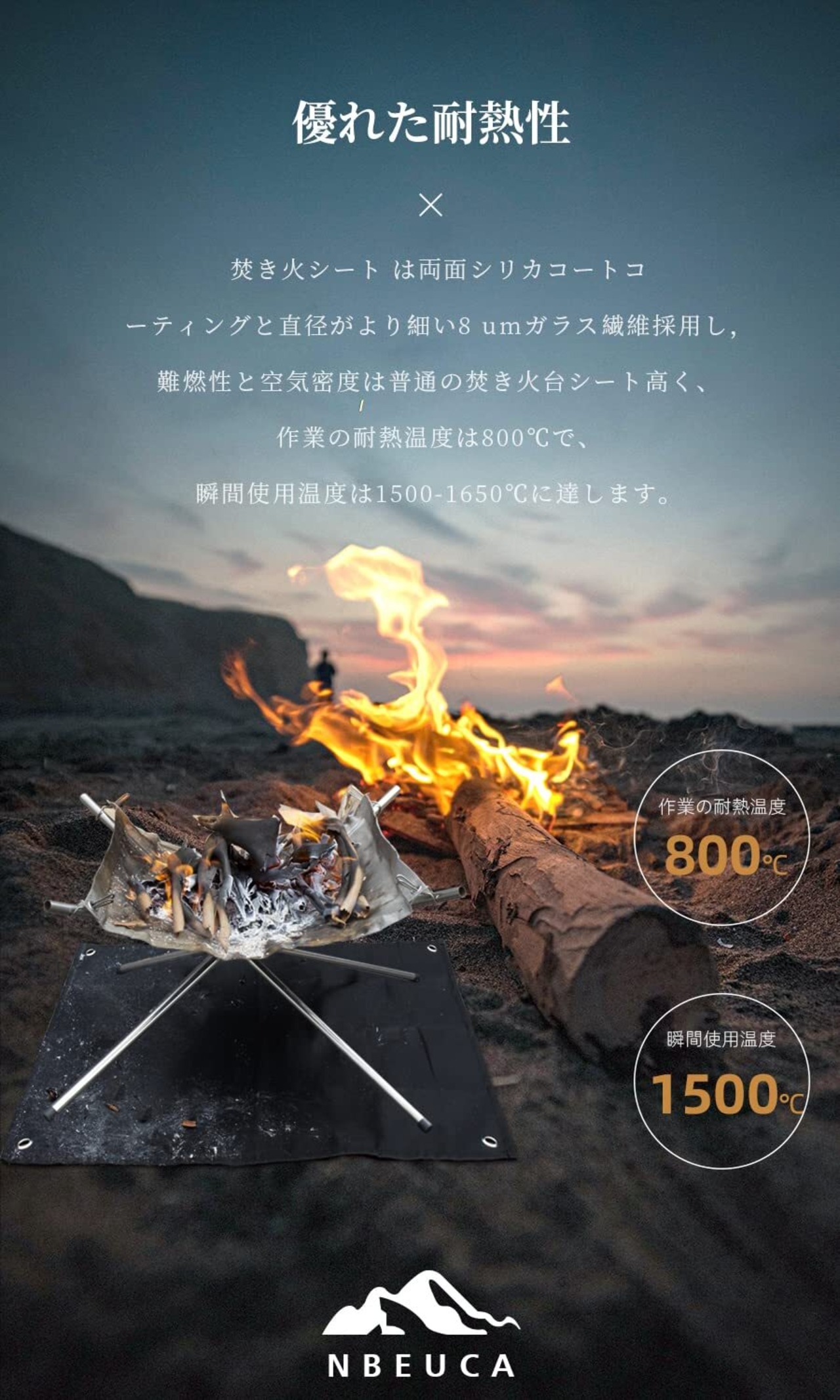 【耐火性がより強い】耐熱シート は直径がより細い8umガラス繊維採用し,難燃性と空気密度は普通の焚き火台シート高く、作業の耐熱温度は550℃で、瞬間使用温度は800-1300℃に達します。