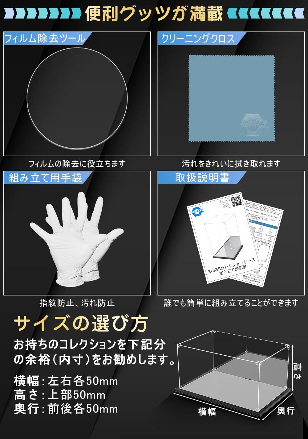 【組立簡単】固定ピンを押すだけの簡単取付、接着剤や工具は不要です。組み立て時に指紋や埃が付かないように手袋とクロスが付属、アクリル面をクリアに保つことが出来ます。アクリル板には剥がしやすい保護フィルムを採用、更にフィルム除去ツール付き。フィギュアケース全体を持ち上げても崩さない、展示物の出し入れが楽々。