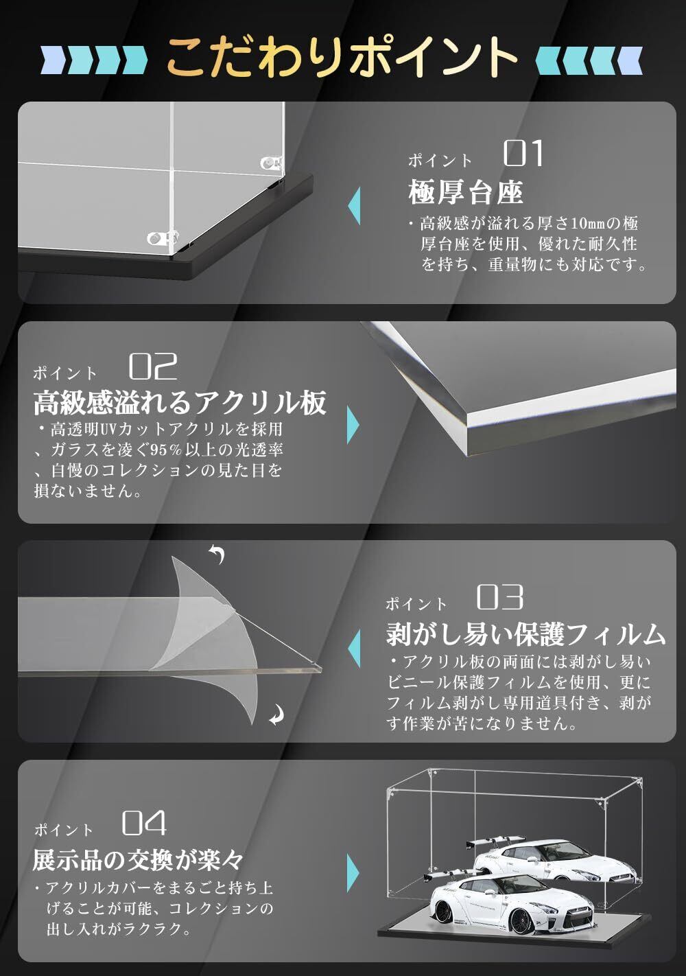 【見栄えアップ】高透明UVカットアクリル素材を使用、大切なコレクションを紫外線によるダメージから守ります。優れた耐久性と高い透明度を兼ね備えているため、ホコリやキズから守ると同時にコレクションをアクリル越しでもキレイに魅せます。