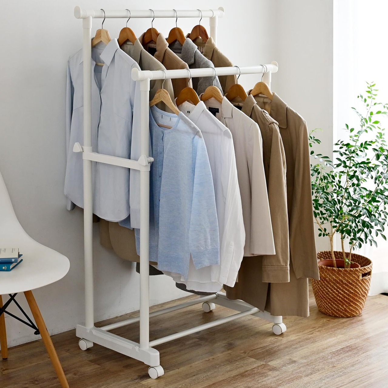 【シンプルだからあらゆる場面で活躍】一人暮らしの衣類収納、玄関のコートハンガー、会社の更衣室などの業務用まで、幅広くお使いいただけます。キャスター付きなので掃除や場所移動もラクにできます。前後にバーのあるダブルタイプなので、よく使う物は手前に、季節外のものは奥に、などの使い方もできます。シングルと同じサイズながら2倍の収納力が魅力です。