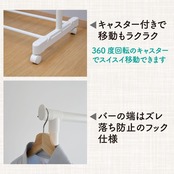 【シンプルだからあらゆる場面で活躍】一人暮らしの衣類収納や、玄関のコートハンガーとしてなど幅広くお使いいただけます。キャスター付きなので掃除や場所移動もラクにできます。前後にバーのあるダブルタイプなので、よく使う物は手前に、季節外のものは奥に、などの使い方もできます。シングルと同じサイズながら2倍の収納力が魅力です。
