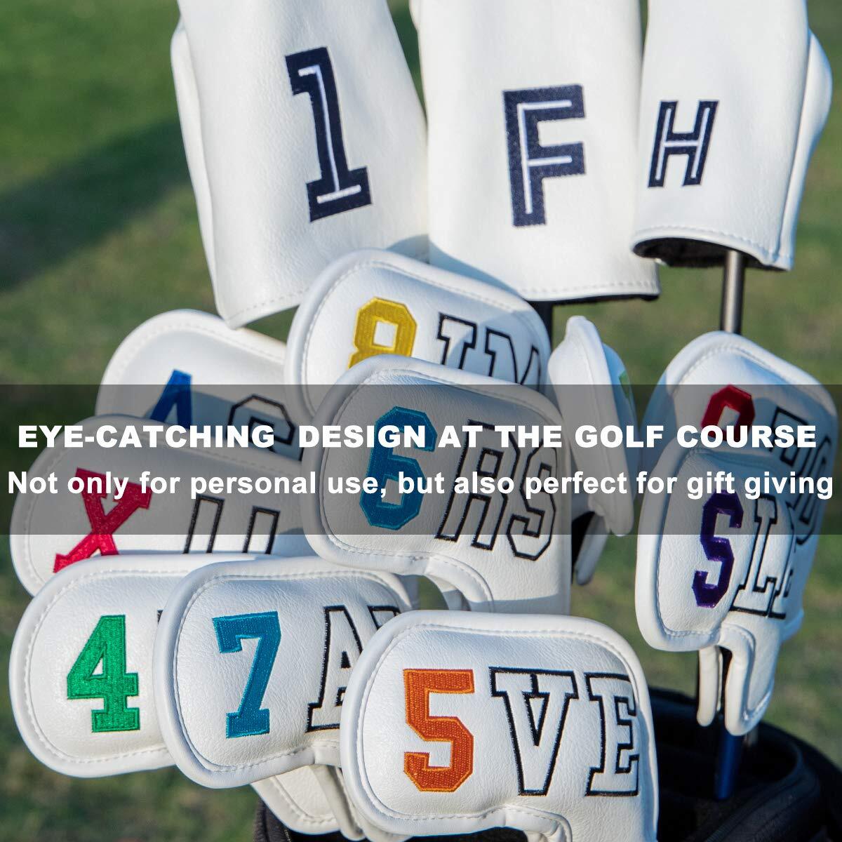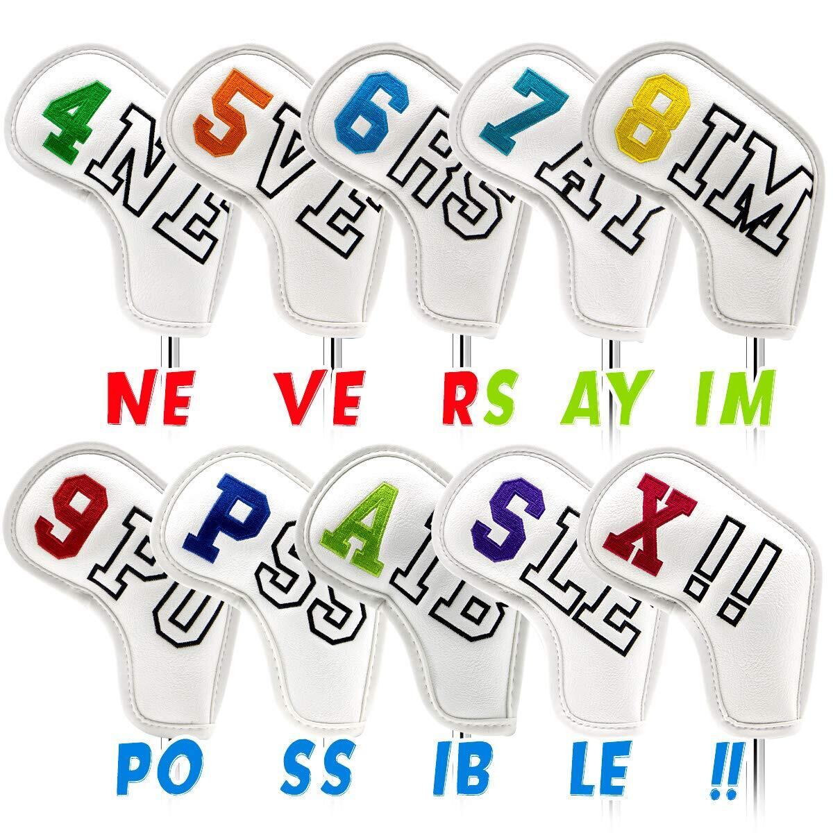 ゴルフアイアンカバー Aliennanaゴルフクラブヘッドカバーアイアン用 10個セットNEVER SAY IMPOSSIBLE 番手付き 高級刺繍 シンプル アイアンカバー レディース・メンズ マジックテープ開閉 革製