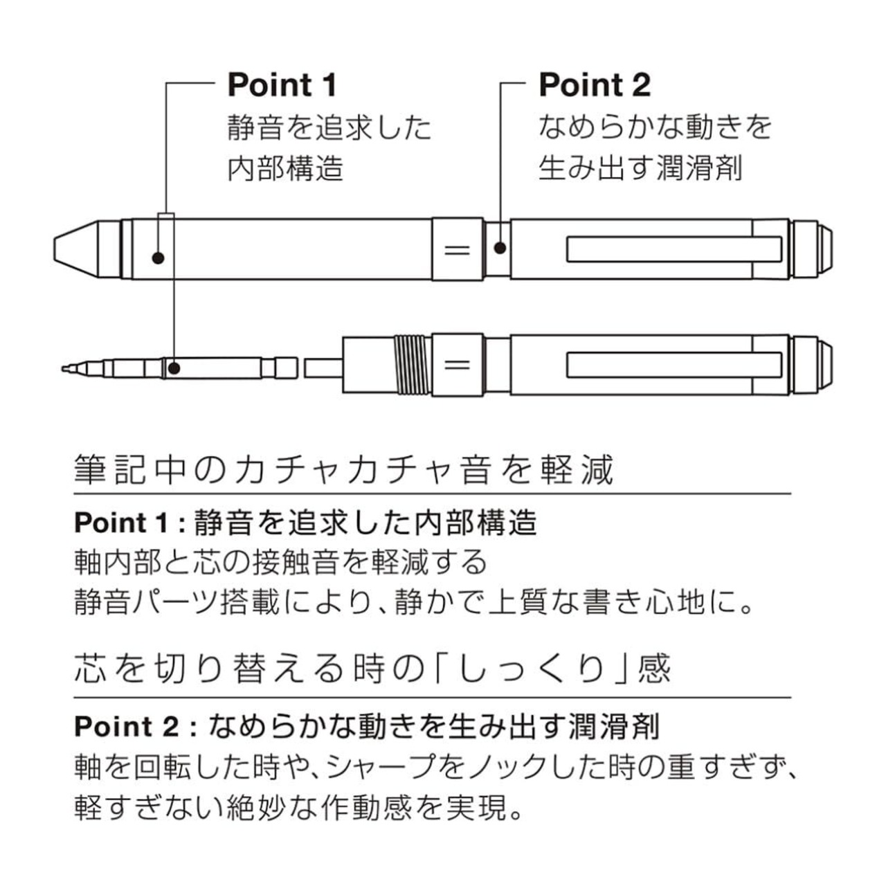 ●point1:筆記中のカチャカチャ音を軽減静音を追求した内部構造(軸内部と芯の接触音を軽減する静音パーツ搭載により、静かで上質な書き心地に)