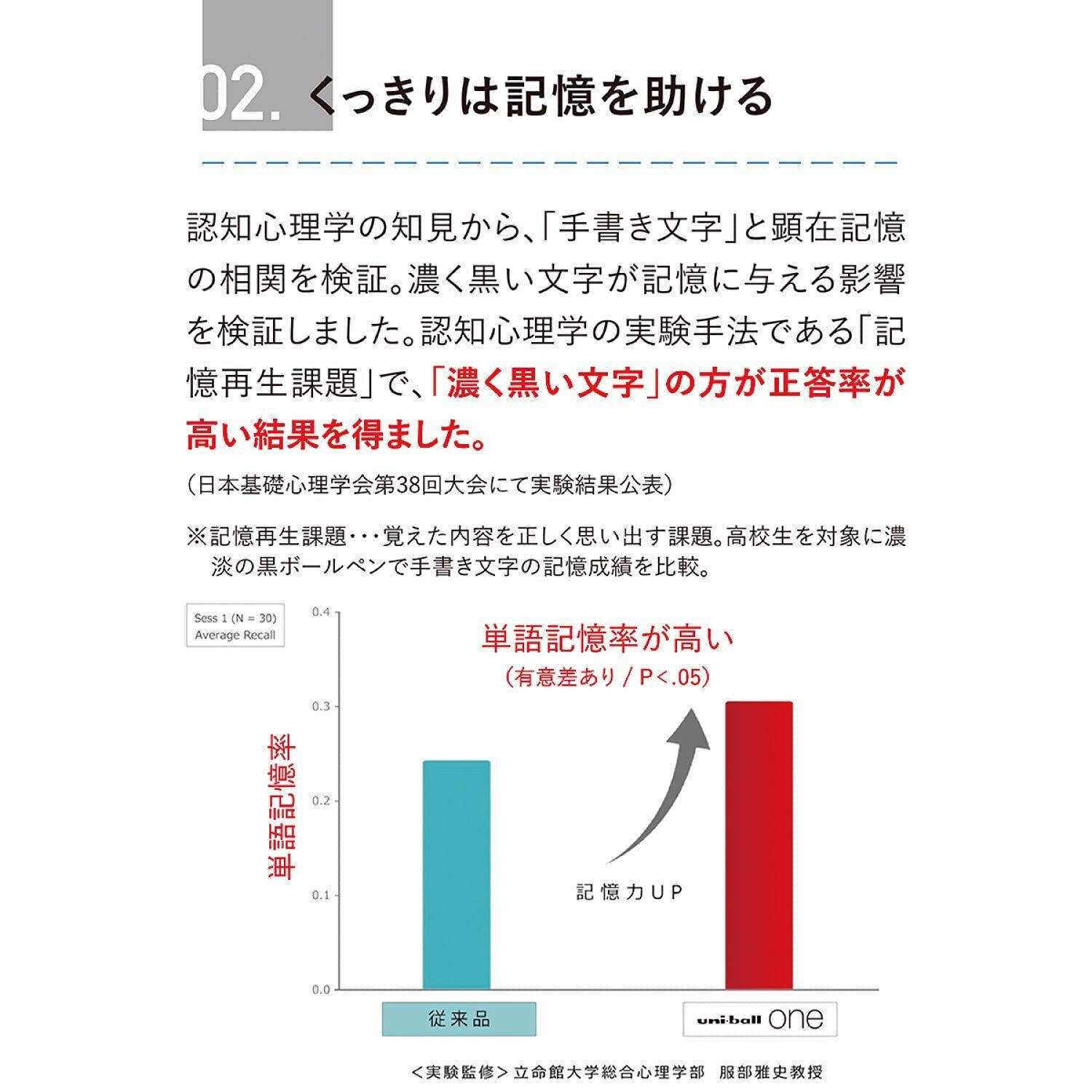 ・にじまず、速乾性の高いインク/新開発の「ユニボール ワンインク」は、インク内の固形と液体の成分比を変えることで、液体成分を素早く紙面へ浸透させながらも、固形分である色材を紙面に残すことを可能にしている。