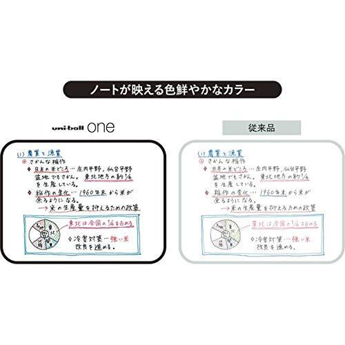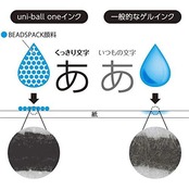 新開発の『uni-ball one(ユニボール ワン)』のインクは、一般的なゲルインクと異なり、色材の紙繊維への浸透を極力抑える、新しい顔料を使用しています。 黒は一層濃く、カラーはより鮮やかに発色し、記憶に残りやすい、くっきりキマる文字が書けます。