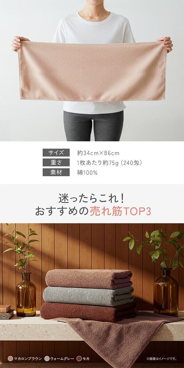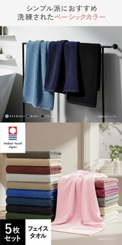 【仕様】■今治タオルブランド認定済 ■数量:5枚 ■サイズ:約34cm ×86cm ■素材:綿100% ■重さ:約75g(240匁) ■カラー:サンド、ホワイト(白)、セージ(緑)、ピーチ、モカ(ブラウン)、クリーム、ホワイトゴールド、ブラック(黒)、ラズベリー(紫)、ローズ、ベージュ、ネイビー(紺)、マカロンブラウン、ベビーピンク、ライトネイビー ■認定番号:2013-734 ※ネイビーの色味が変更になりました。2022/2月末出荷分より濃紺に近い落ち着いた色合いになります。