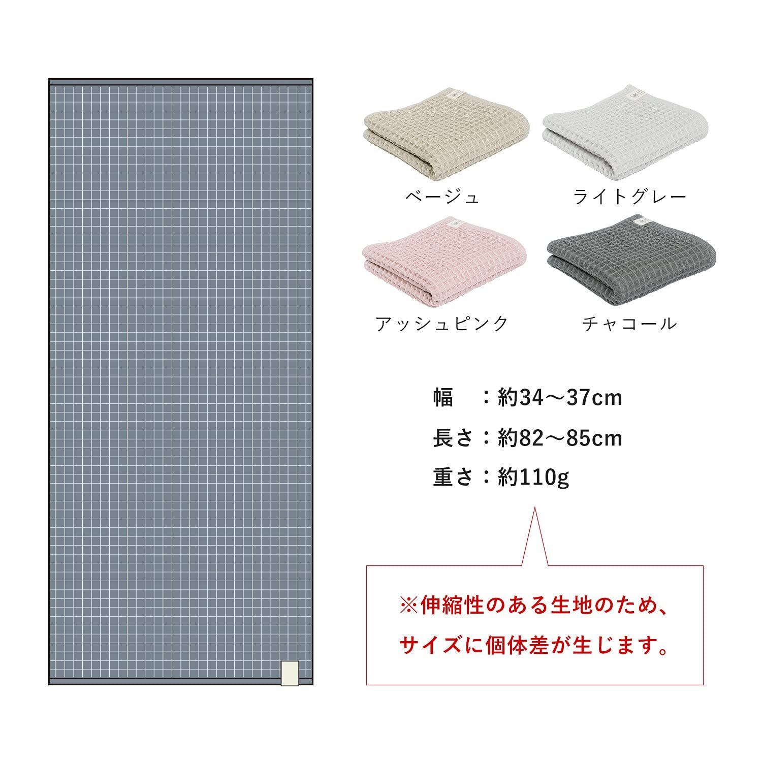【商品詳細】サイズ(幅):約34~37cm (長さ):約82~85cm 重さ:約110g 素材:綿100% 原産国:日本/今治 カラー:全4種(ベージュ、ライトグレー、アッシュピンク、チャコール)