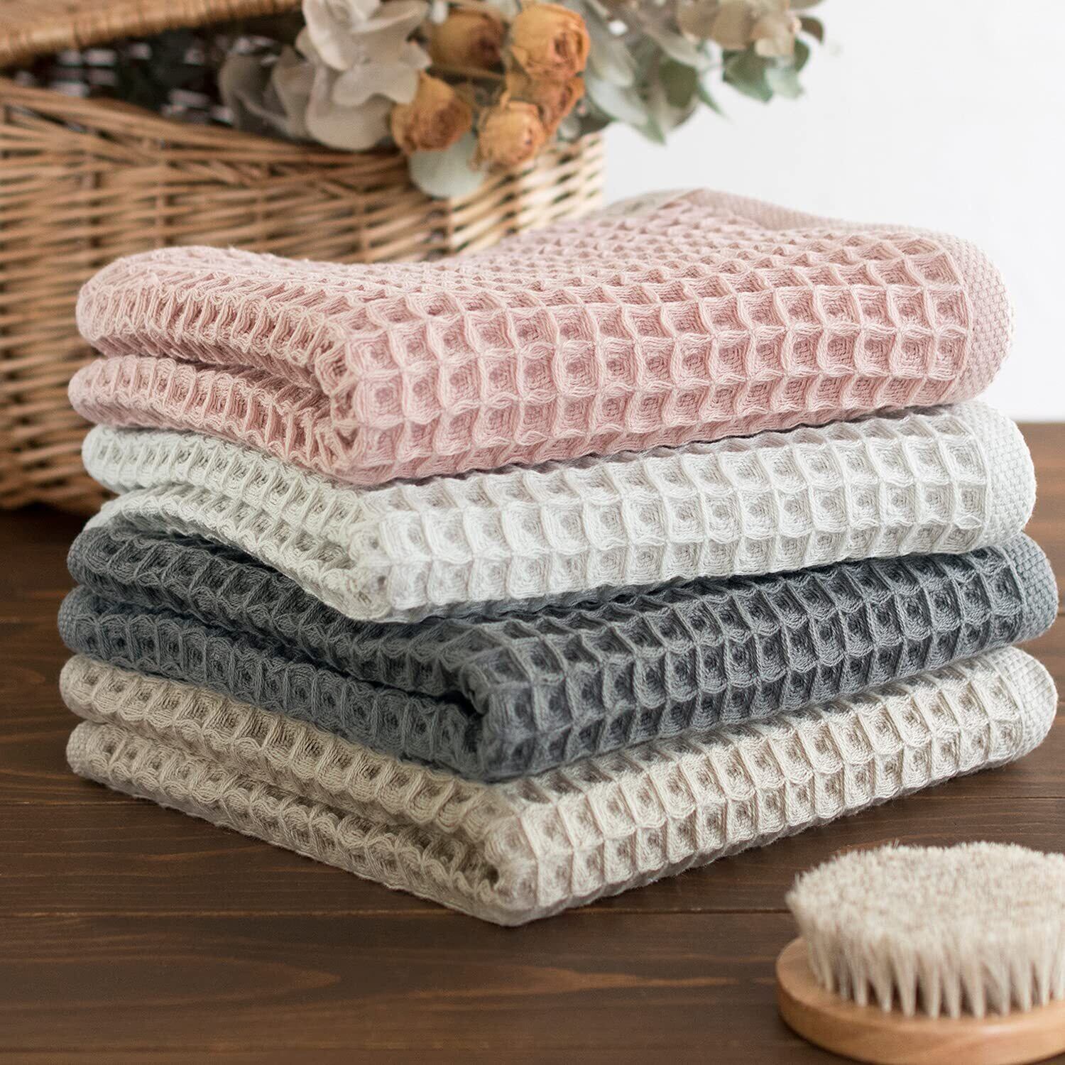 【ワッフル生地の特徴】デコボコとした凹凸が可愛いワッフルタオル。通常のタオルより毛羽立ちが少ないのが魅力。肌に触れる面積が少ないので乾きやすく、衛生的にお使いいただけます。
