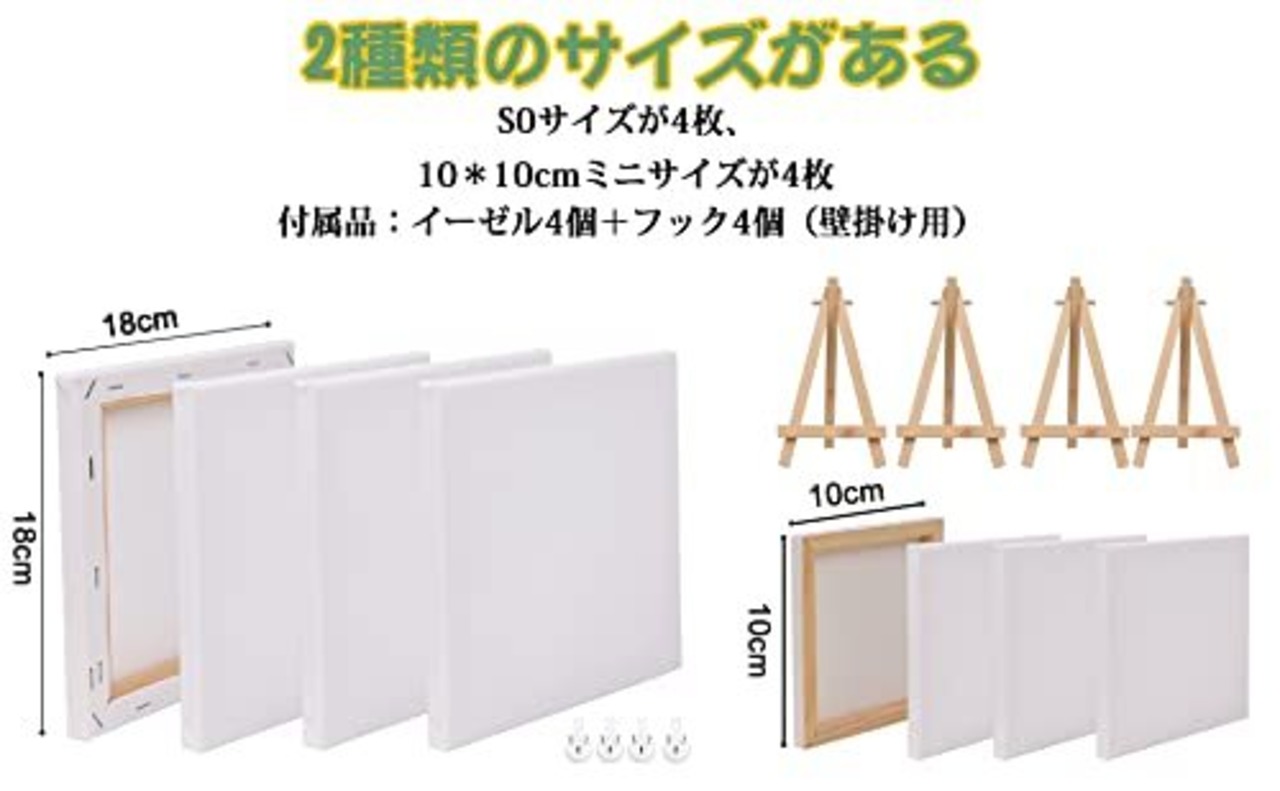 【お得な8枚セット】:セットには2サイズのキャンバスがあり、S0サイズとミニサイズが各4枚あり、 全部8枚。壁かけ用フックとイーゼルが4個入り。発送の便利さのために、ミニキャンバスはS0にはめ込まれて包装しています。ご了承ください。綿化繊混紡とライト木枠を採用しており、丈夫で変形しにくい。保護フィルムで丁寧に包まれており、張りキャンパスをしっかり保護しています。