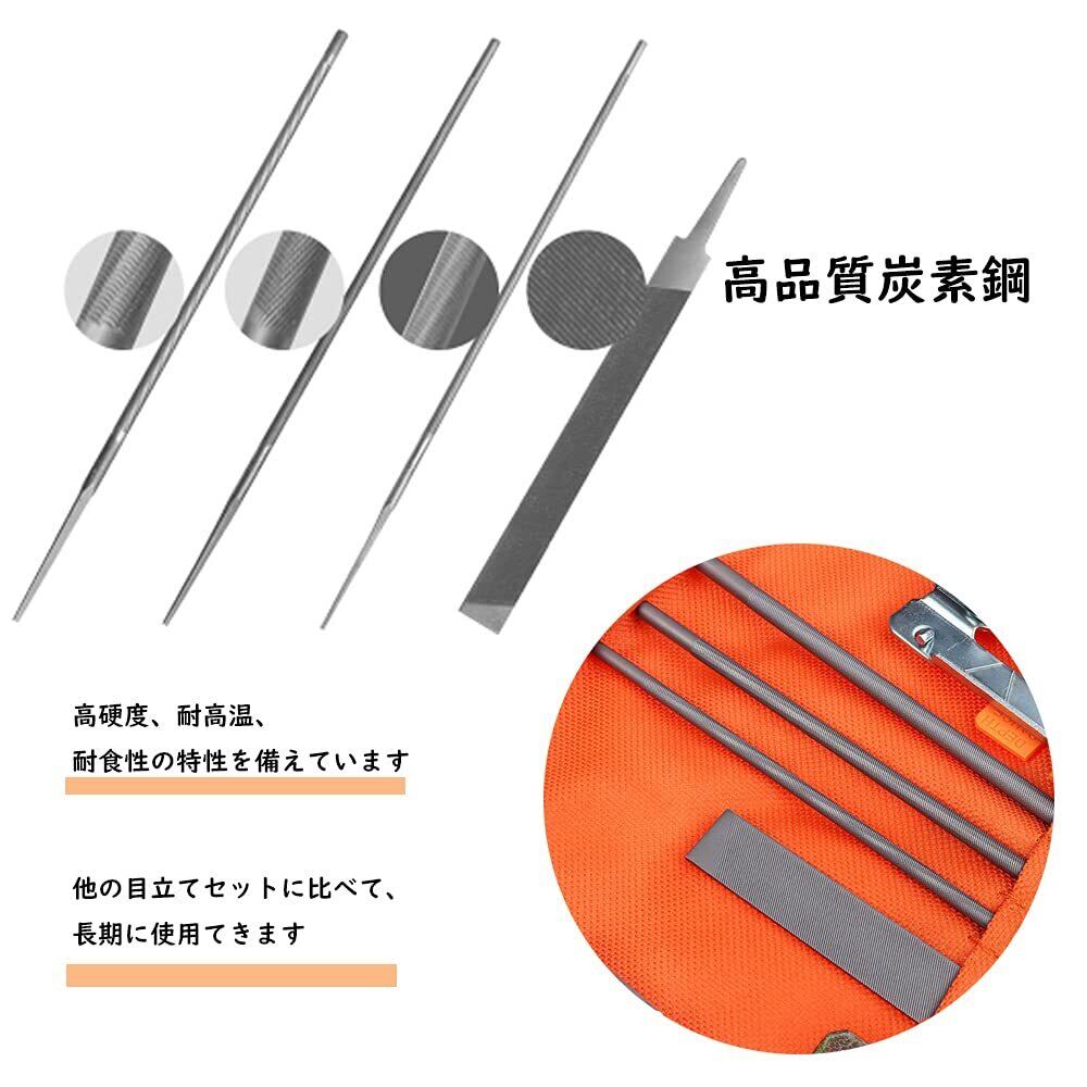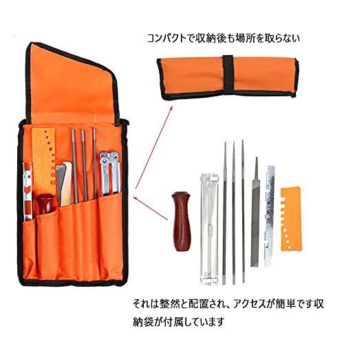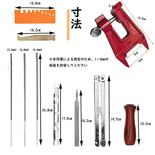 10点セット チェーンソー目立てセット チェーンソー 目立てホルダー チェーンメンテナンス 道具 丸ヤスリ3種 4.0mm/4.8mm/5.5mm 裁断時計ゲージ 裁断ブラケット 木製ハンドル 深さゲージ 収納袋付き 削り器 木工用 DIY