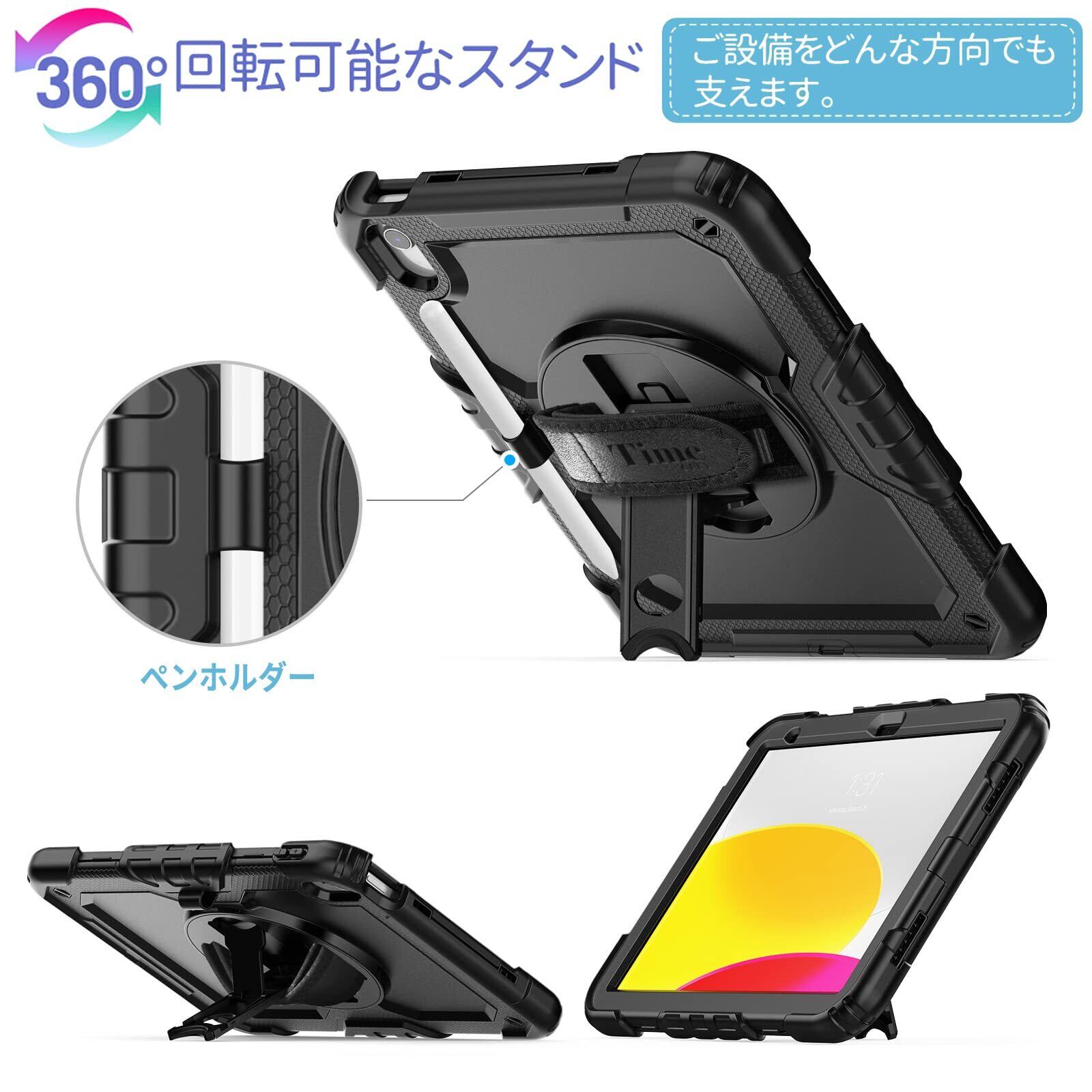 【新着商品】Timecity iPad 11世代/ 10世代 ケース 2025新モデル (A16) 耐衝撃 保護フィルム 360°回転スタンド ペン収納 ハンド&ショルダーストラップ付き 頑丈 落下保護 傷防止 仕事 多機能 2025/2022 iPad 第11/10世代 全面保護カバー(ブラック)(適格請求書発行可能) | ニコニコSHOP