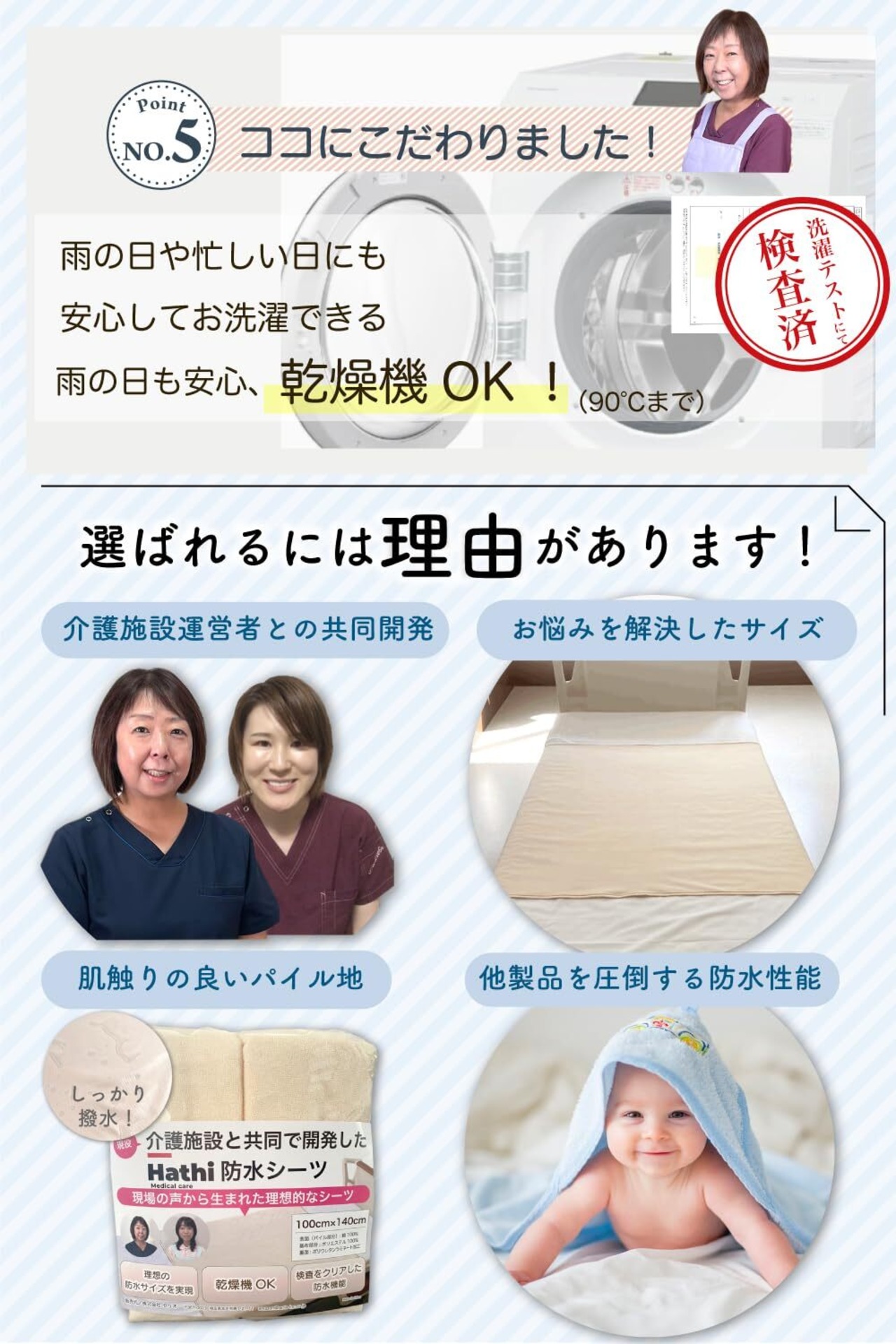 【折り込みやすい横幅&綿100%の柔らかいパイル地】 介護ベッドのサイズを考慮して140cm幅でつくりました。防水シーツは様々なサイズがありますが、 こちらのサイズは他のおねしょシーツや介護用防水シーツと比べて扱いやすいサイズに変更しました。 また、ラバーシーツや使い捨て 防水シートにはないパイル地の柔らかい肌触りにもこだわりました。