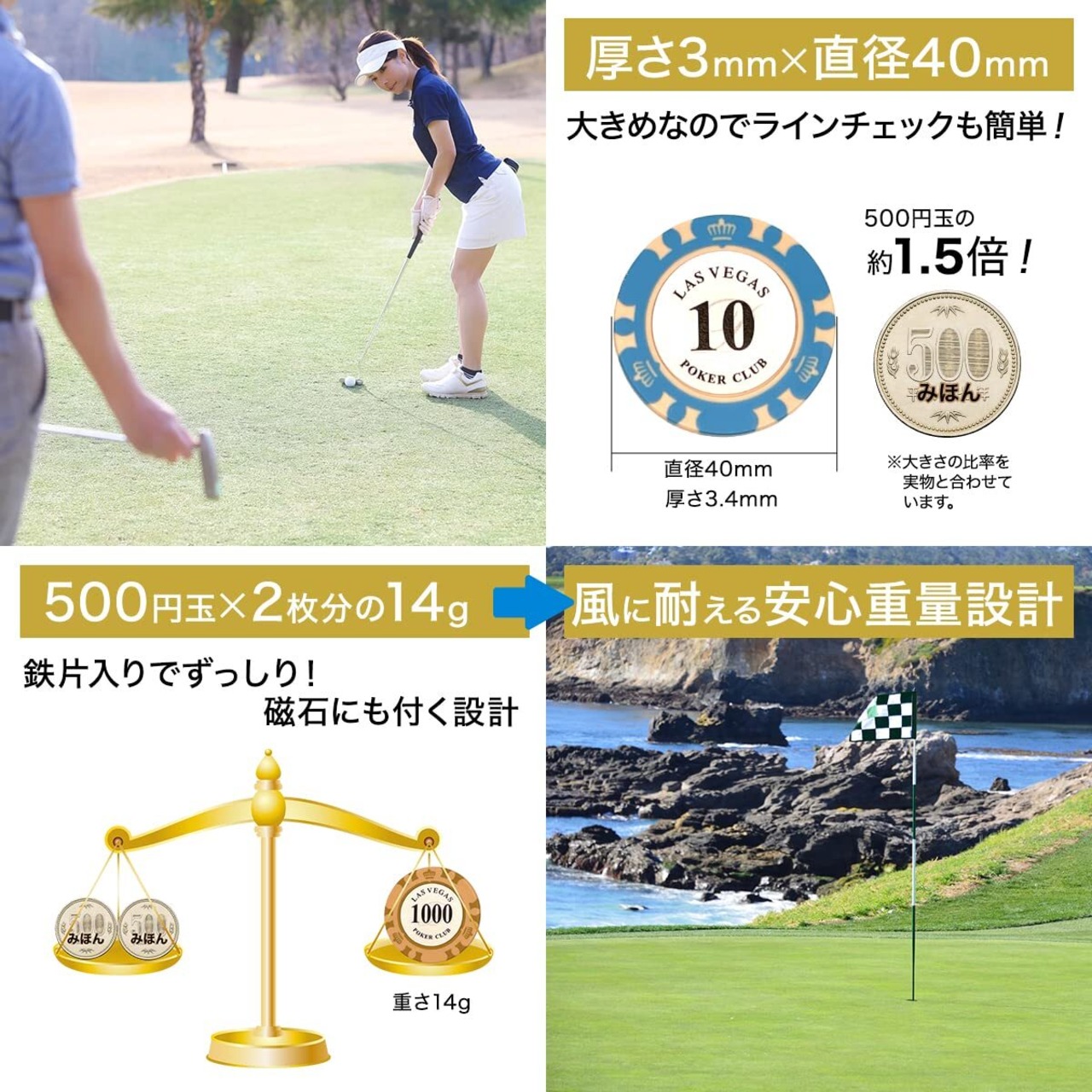 グリーン上で目立つビッグサイズ+飛ばされないズッシリ重量設計(直径40mm、厚さ3.4mm、重量14g→500円玉でちょうど2枚分です)