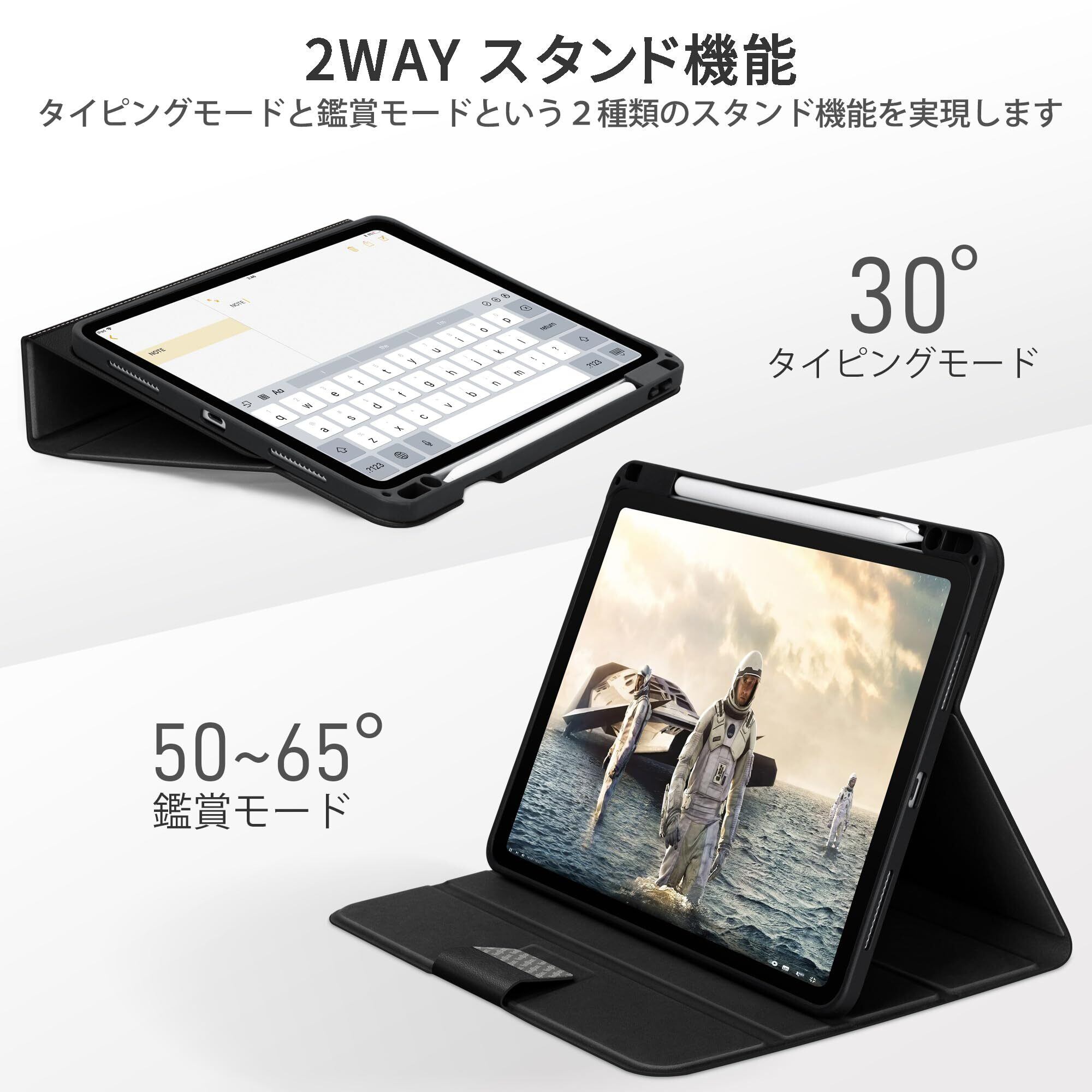 【スタンド機能付き】二段階の滑り止め溝を設置し、お好みの角度を調整できます!また、タイピングモードは、仕事などの文字入力やEメールなどの操作に便利で、鑑賞モードの場合はFace Timeや動画、映画鑑賞などにオススメです。