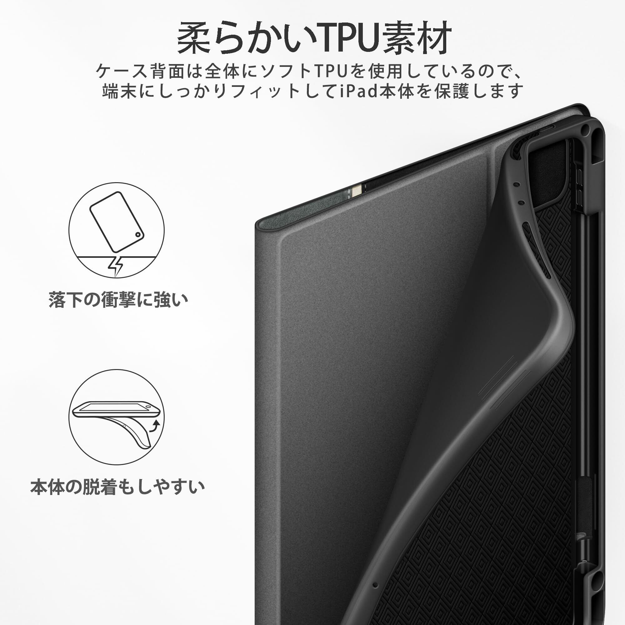 【全面保護・衝撃吸収】高柔軟性があるTPU、耐久性に優れたPUレザーなどの素材採用しており本体を優しく守ります。iPadケースとカメラやディスプレイに高低差があり、高いところから落とした場合でもiPadへの衝撃を吸収し、液晶画面が割れないよう設計されています。