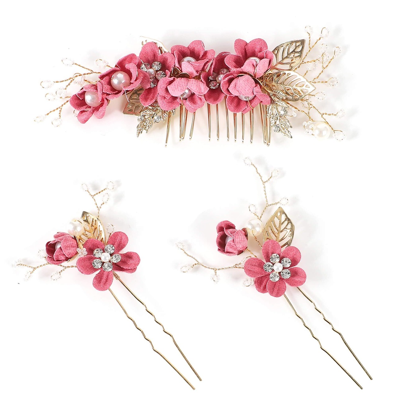 [REOTTI] ヘアアクセサリー 結婚式 ヘアピン ゴールド Uピン パール フラワー お呼ばれ 和装 七五三 卒業式 ローズレッド