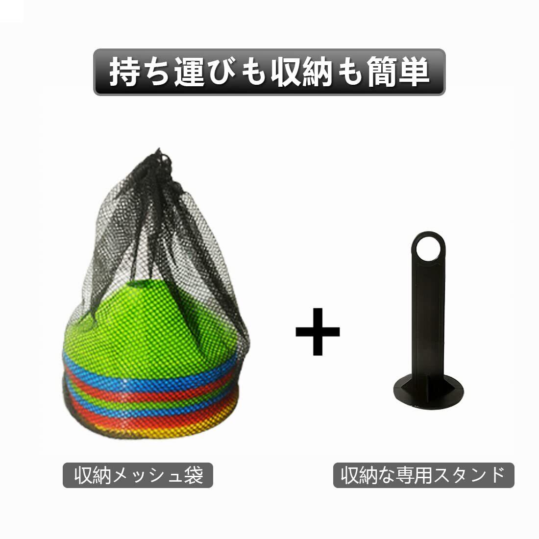 セット内容 : 収納袋・専用スタンド+マーカーコーン60個セット (赤、青、黄色、緑、オレンジ各12個) 直径19cm(下部)、高さ5cm