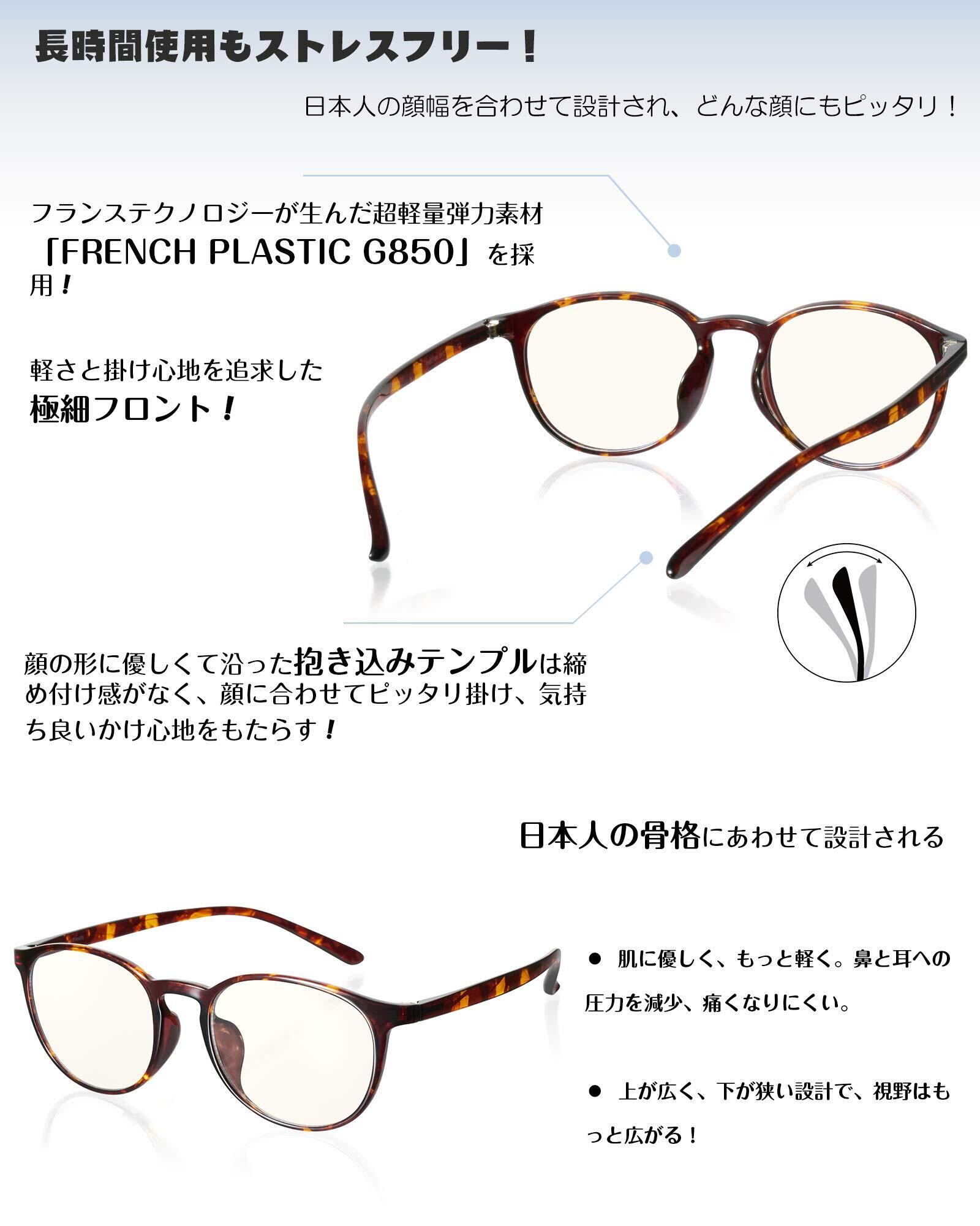 【超軽い掛け心地】超軽量弾力「FRENCH PLASTIC G850」材質を採用し、思ったよりすごく軽くて圧迫感もなく快適な掛け心地!毎日使ってももちろん!日本人の顔幅を合わせて設計され、どの顔にも気楽に掛けられる!