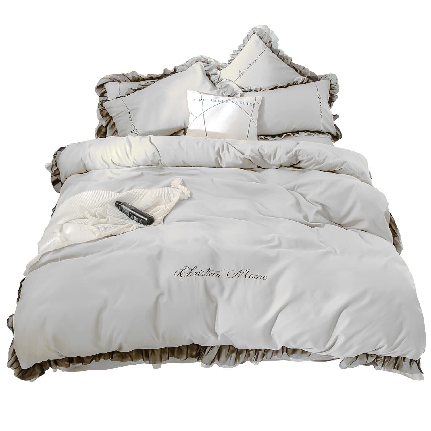 SowooHome 布団カバー シーツ 刺繍 蓮の葉 寝具カバーセット 掛け布団カバー ボックスシーツ 枕カバー ベッド用 布団用 洗い替え速乾タイプ(シルバーグレー, シングル・3点セット)