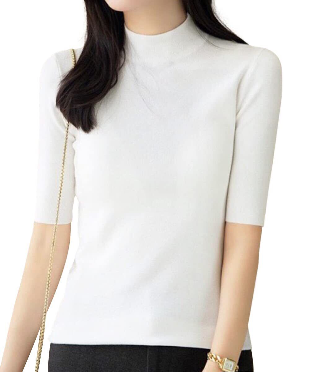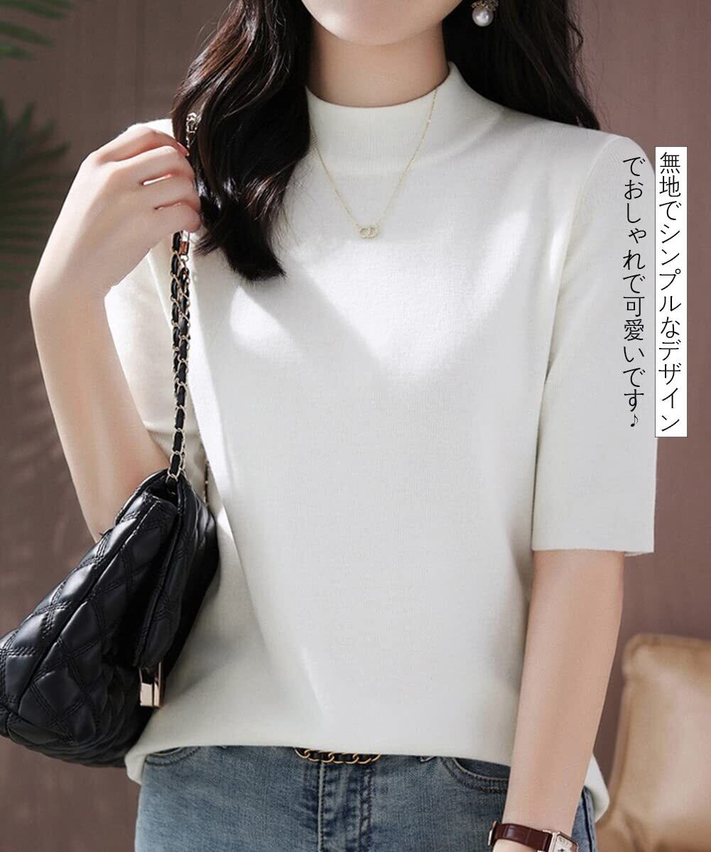 【特価商品】[Bidason] リブ ニット レディース 五分袖 立ち襟 サマーニット カットソー 伸縮性良い 柔らか 薄手 着痩せ 着回し力 無地 シンプル おしゃれ きれいめ 通勤 デート ニットソー 春 夏 | ニコニコSHOP
