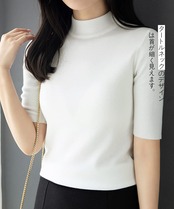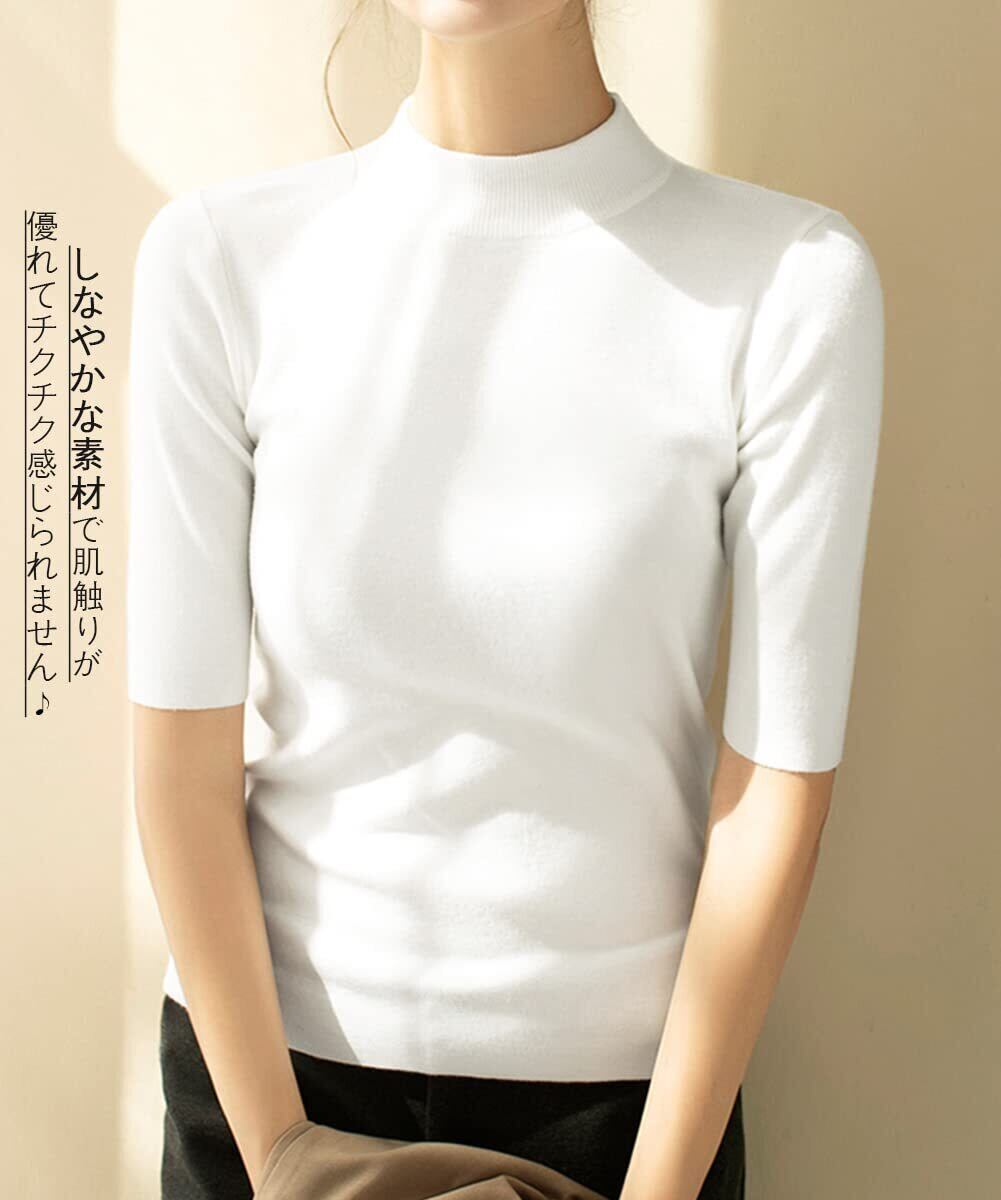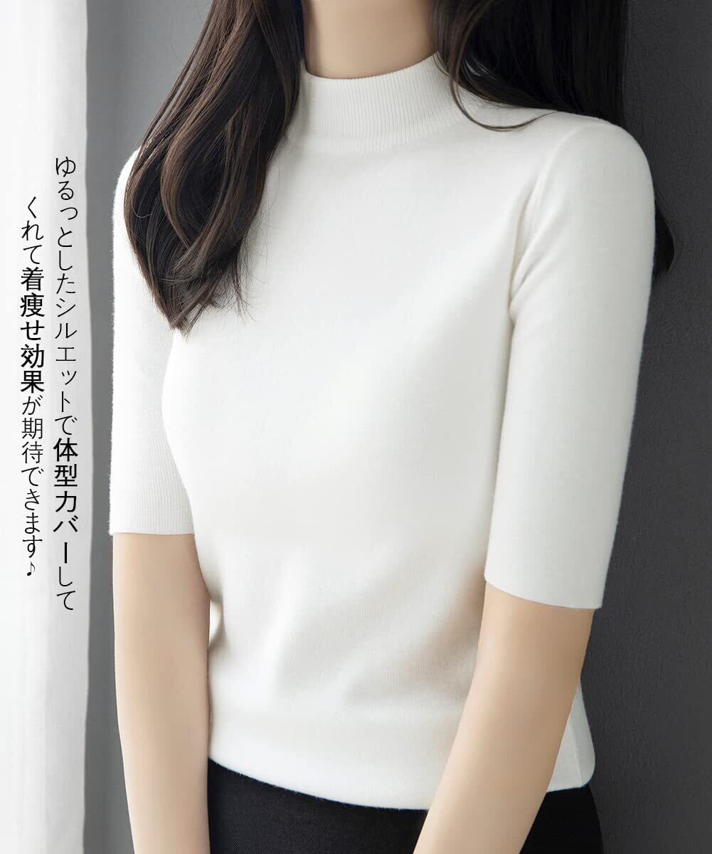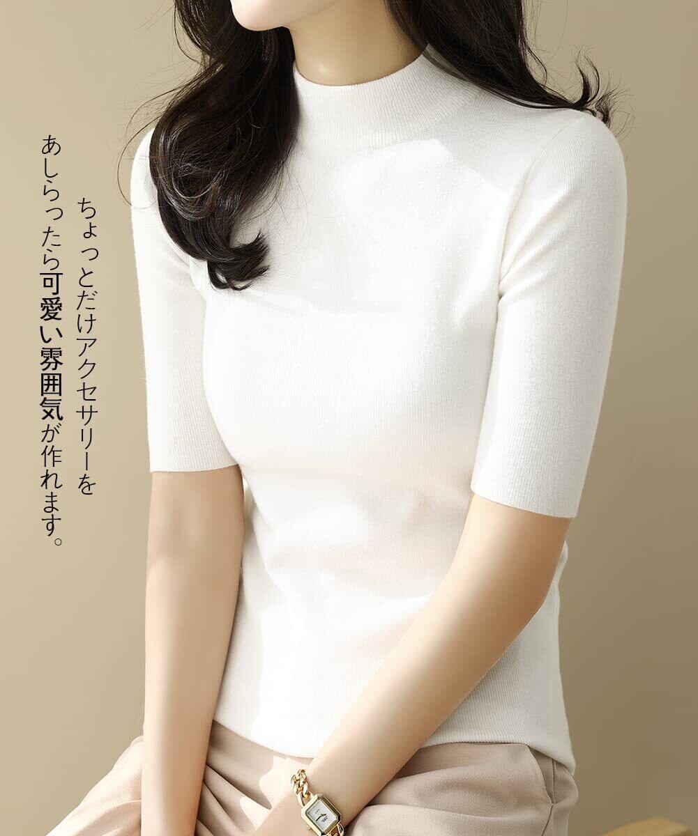 1.五分袖のレデースサマーニット。細身に見せてくれるサマーニット、ピタッとする感じで、体のラインを割としっかり出るので、気にする方はワンサイズ大きめをお選びいただきます。タートルネックのデザインは首が細く見えます。ちょっとだけアクセサリーをあしらったら可愛い雰囲気が作れます。無地でシンプルなデザインでおしゃれで可愛いです。二の腕をが隠れる五分袖の仕様で、腕が細見えます。これからの春と夏におしゃれに着こなせるリブニットです。タートルネックのデザインは首が細く見えます。ちょっとだけアクセサリーをあしらったら可愛い雰囲気が作れます。無地でシンプルなデザインでおしゃれで可愛いです。二の腕をが隠れる五分袖の仕様で、春、夏と秋にも楽に着用頂けるリブニットです。