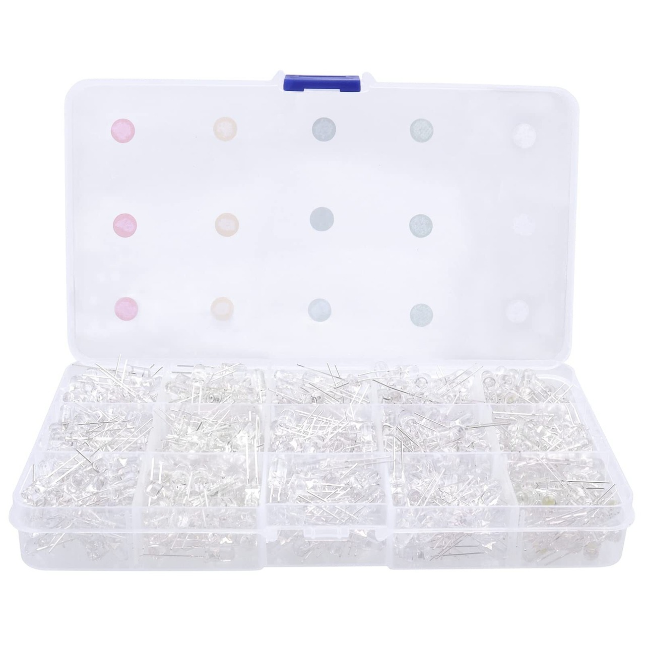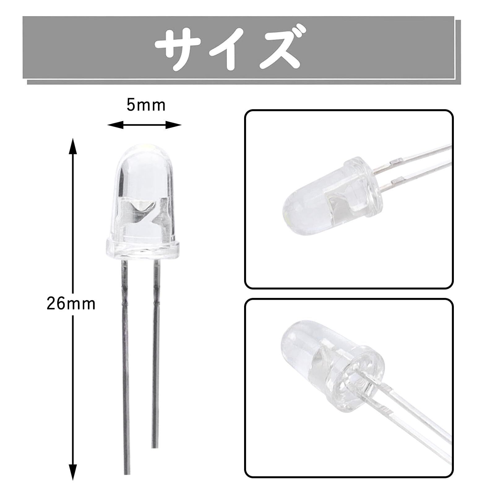 直径:5mm LED 500個(±1%):赤、黄、白、緑、青各100個、収納ケース一つ。波長範囲:赤:620-630nm、黄:580-590nm、緑:520-530nm、青:460-465nm、白:610-620nm。