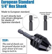 【適用設備】ハンマードリル、電動ドリル、充電式ドリル、インパクトドライバーに適用するドリルチャックアダプター(六角シャンクをドリルチャックに変換するアタッチメント)です。充電ドリルドライバー・インパクトドライバーに装着して、丸軸先端パーツを使っての作業