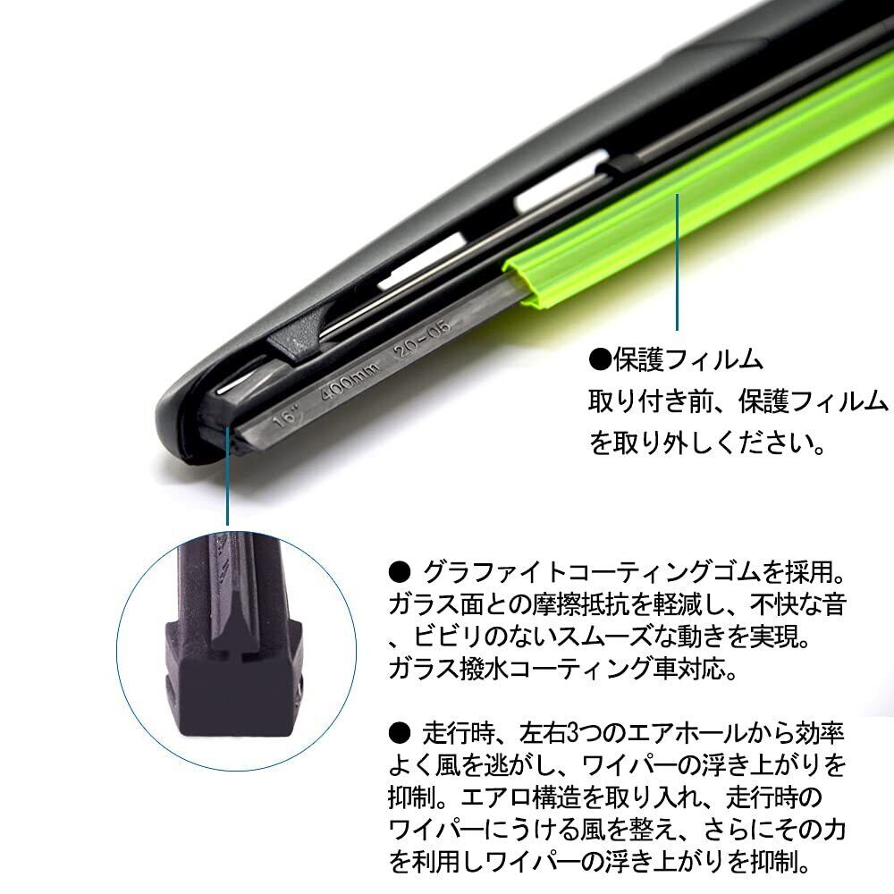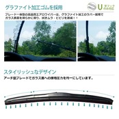 ワイパー設計:ワイパー上にエアホールが付きます。エアホールの数は長さによって異なります。エアロ形状とエアホールにより風を効率的に流し高速走行時の浮き上がりを抑制する事により均一な払拭が可能となり安全な視界を確保。