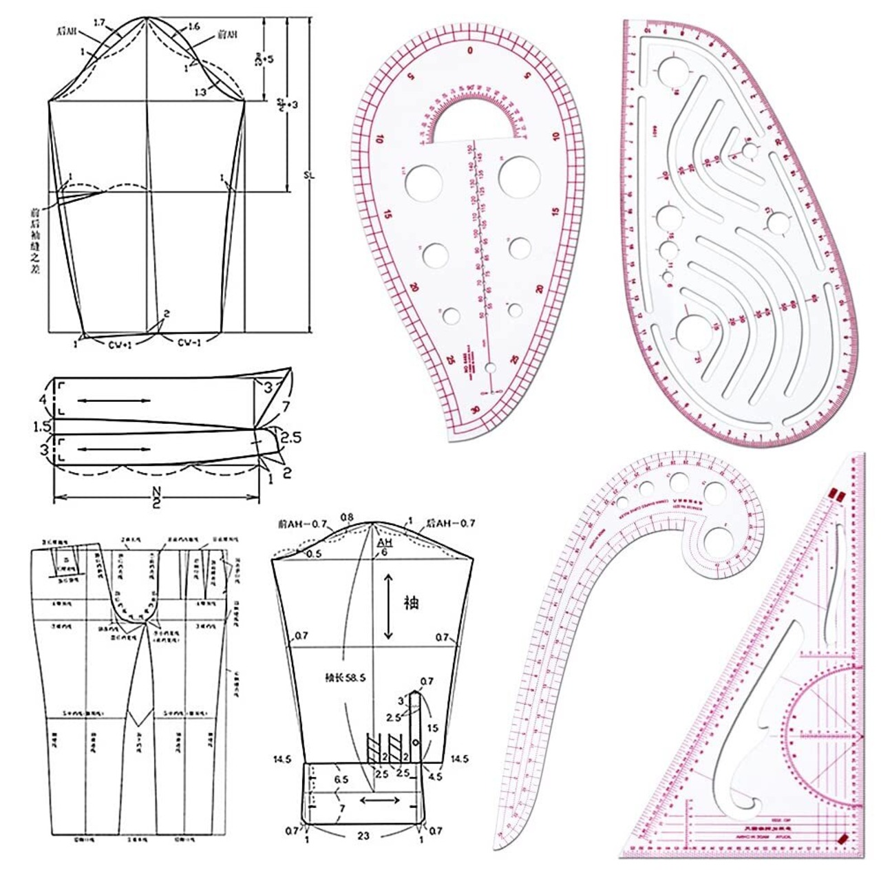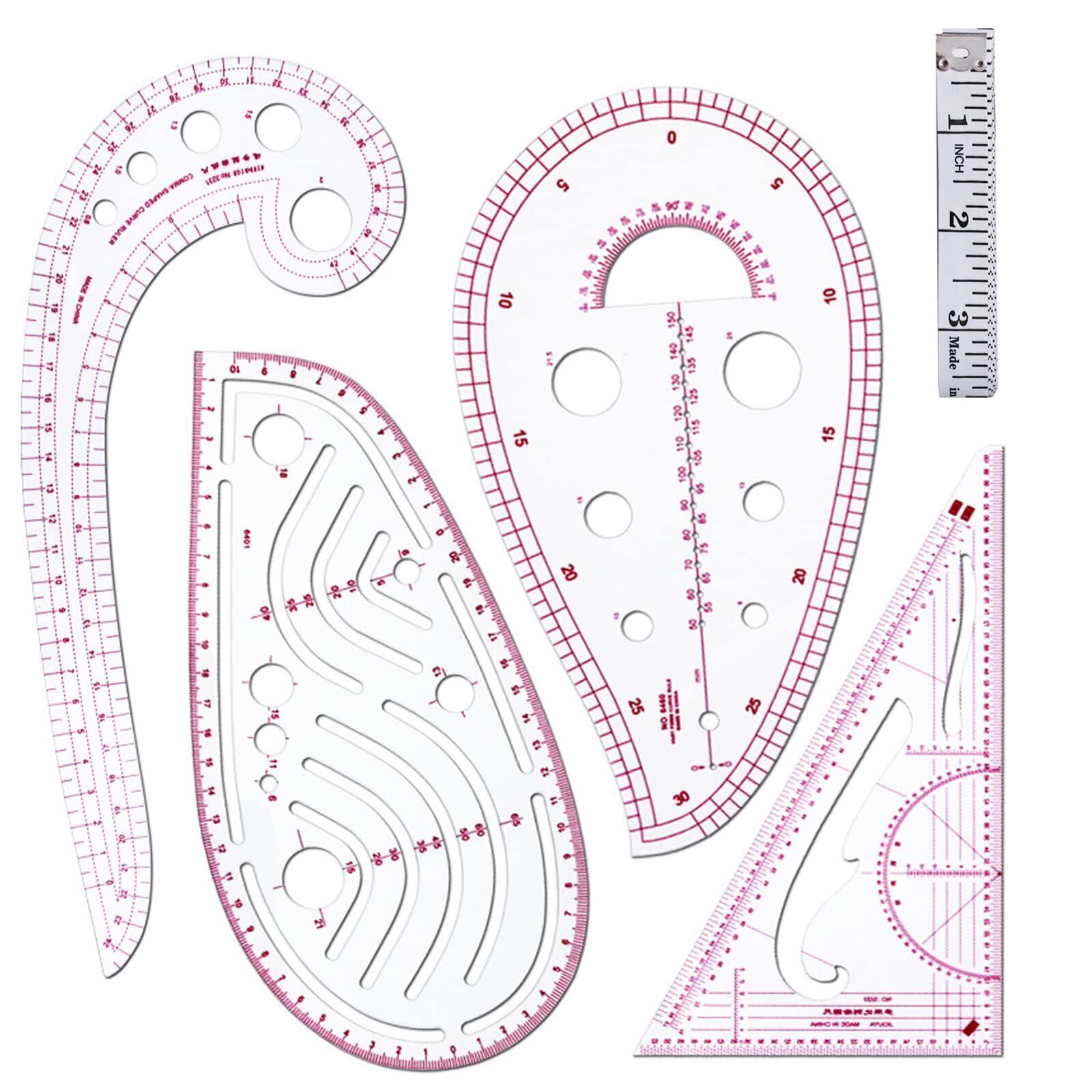 【4枚入り】:セットには、三角定規、カンマ型ルーラー、曲線定規、雲形定規の4種類の縫製定規が含まれております。そして、裁縫用メジャーテープも付属しています。多種類で基本的な描画と仕立てのニーズを満たすことができます。好きな曲線を自由に描かれます。