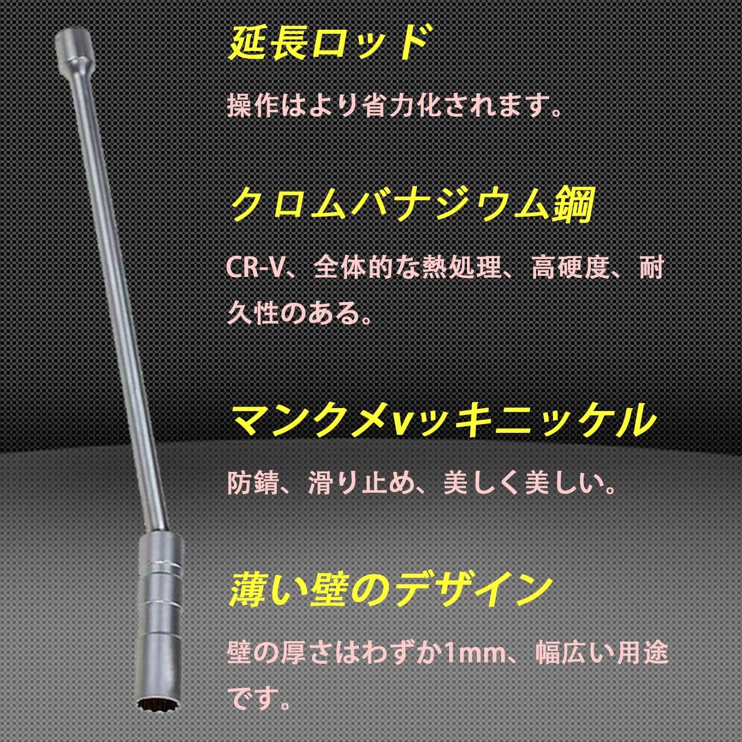 【品質】スパークプラグレンチは耐久性のある高級クロムバナジウム鋼で作られており、全行程高温処理し。腐食を防ぐ。変形することなく、より大きな圧力に耐えることができます。高耐久性と高品質を保証し、より長い使用寿命を確保することができ、