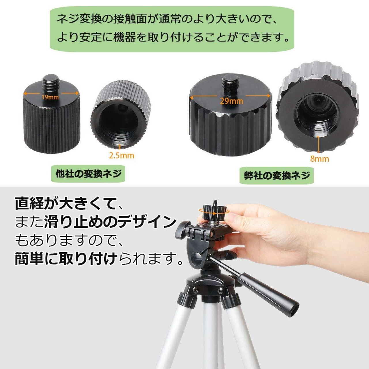 【ネジ規格5/8" -11から1/4 "-20へ変換】大型の機材の墨出し器標準の5/8" -11規格のネジを標準カメラ規格の1/4 "-20に変換できます。手持ちの三脚やスタンドのサイズが合わない場合は、この止めネジ変換アダプターでサイズ変換することができます。スタンドなどを何台も購入する必要がなく、小さい変換ネジがあれば、他の機器と取り付けができます。