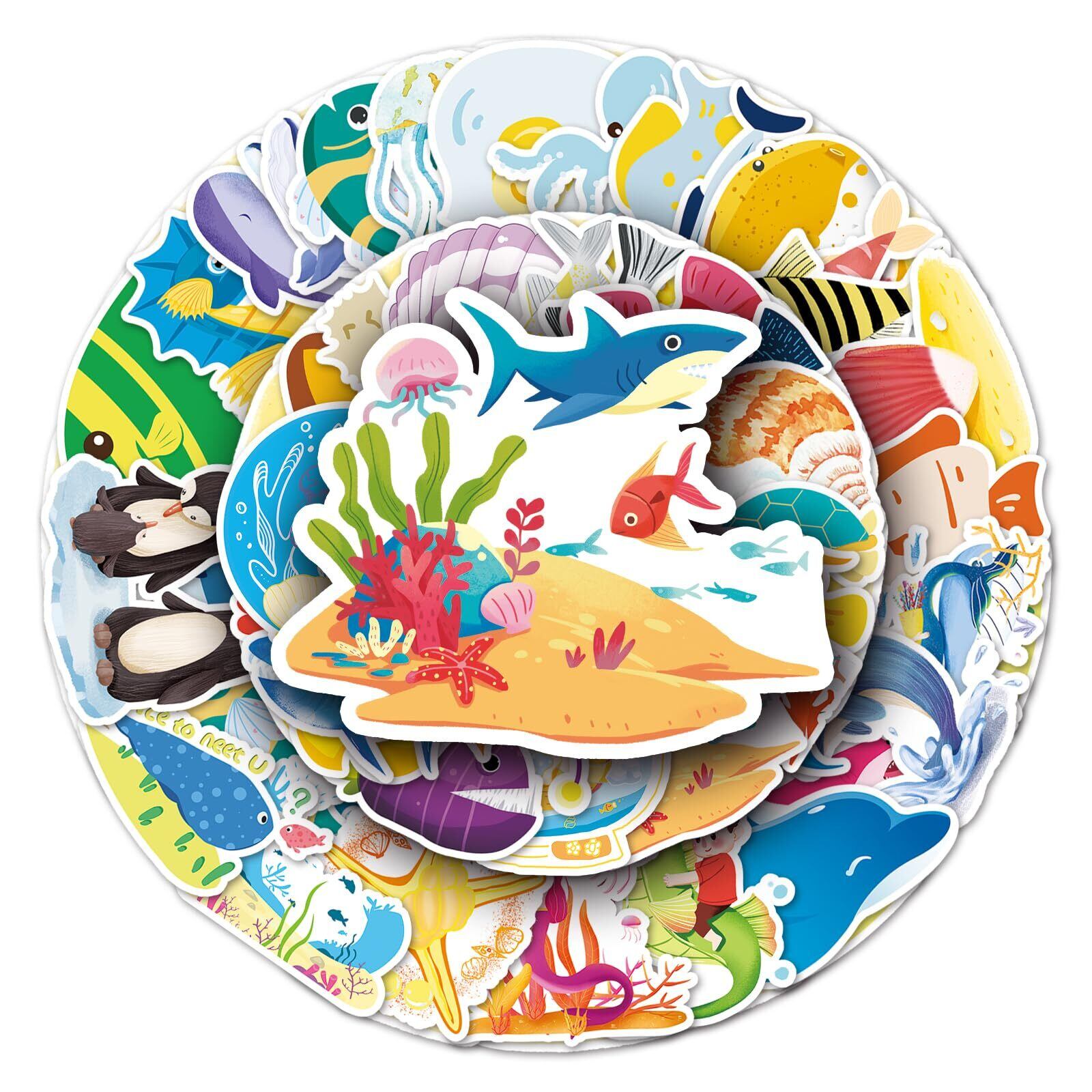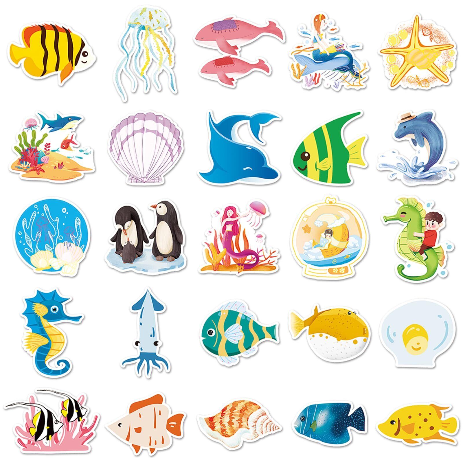 【ステッカーセット】50枚入りで、サイズは4-10センチぐらいで使いやすい海洋生物ステッカーセットです。