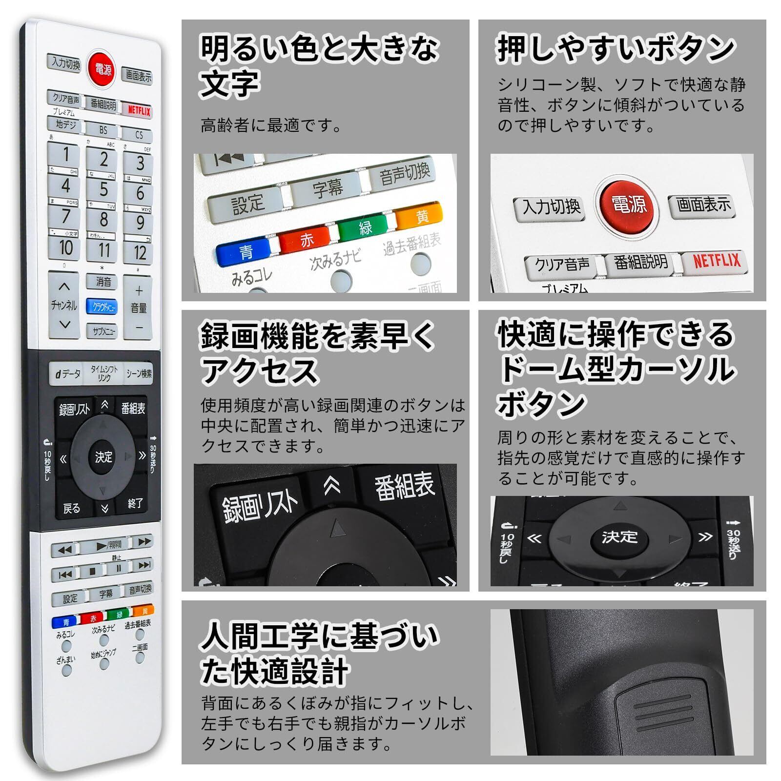 【明るい色と大きな文字】高齢者にも操作しやすいです。ボタンはシリコーン製、ソフトで快適な静音性、ボタンに傾斜がついているので押しやすいです。使用頻度が高い録画関連のボタンは中央に配置され、簡単かつ迅速にアクセスできます。ドーム型カーソルボタン、周りの形と素材を変えることで、指先の感覚だけで直感的に操作することが可能です。