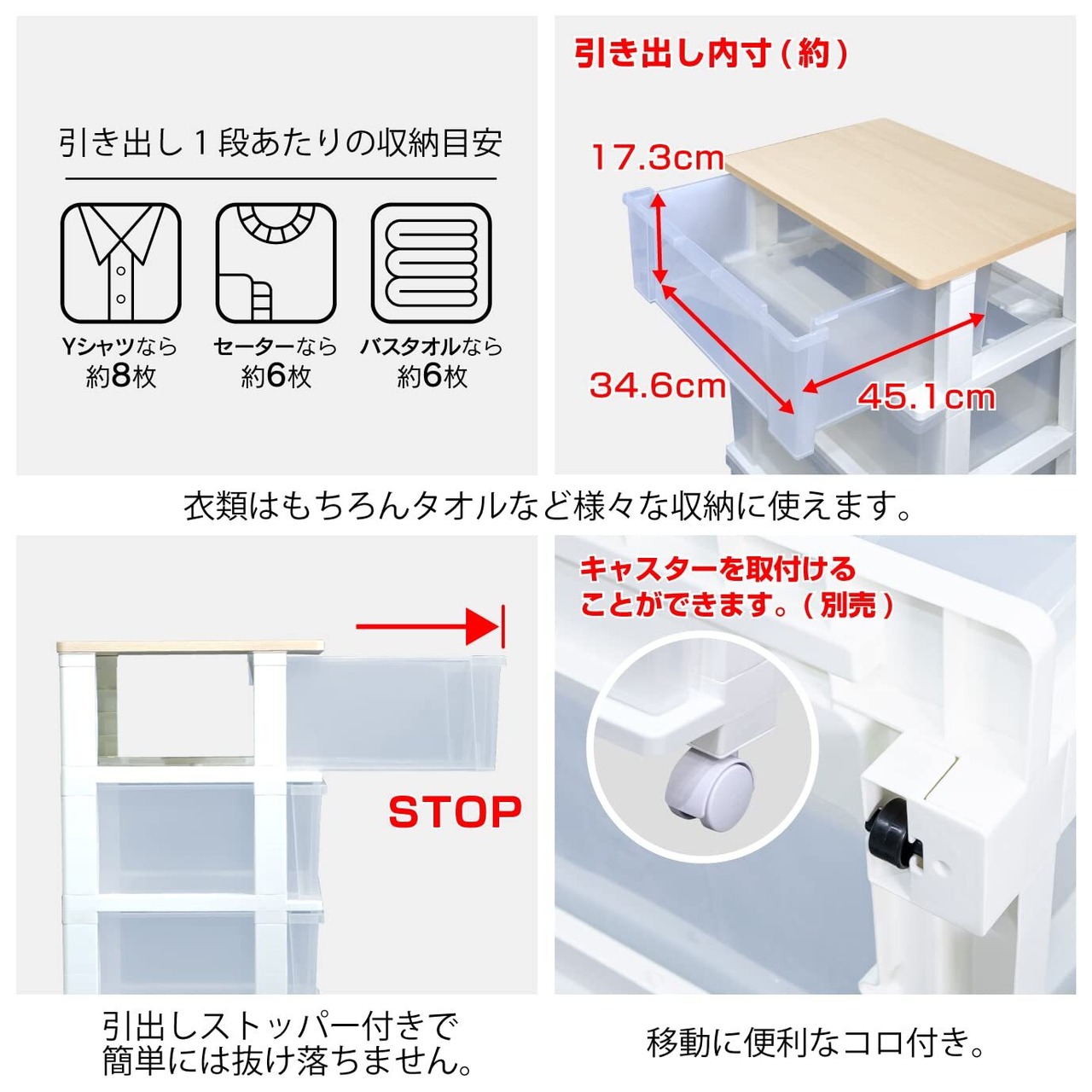 収納目安(約):Yシャツなら6枚、セーターなら4枚、バスタオルなら6枚(引出し1段当たり)