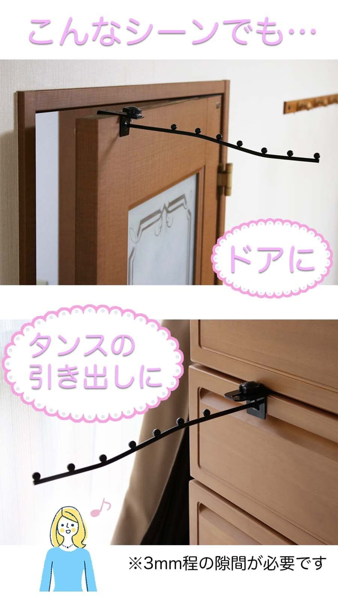 浴室やリビングのドアやタンスの引き出しのふちなど たくさんの箇所で使えるアイテムです。 調節可能なのでひっかけられるところがしっかりと安定させられます。 室内干し時にかけるスペースがなくて困っている方や、 いちいちクローゼットにしまうのが面倒な方 これがあれば取りやすい場所に衣類やバッグをかけておけます。