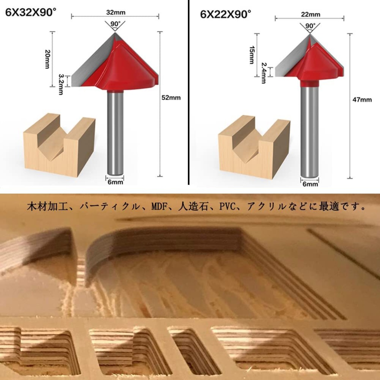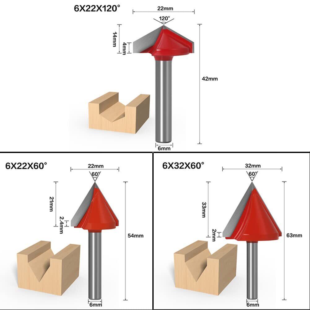 商品:5本 V溝ルータービットサイズ: ❶6mm*32mm*60° 軸径:6mm 、角度:60° 切削径:32mm、切削深さ:33mm、全長:63mm。 ❷6mm*22mm*60° 軸径:6mm 、角度:60° 切削径:22mm、切削深さ:22mm、全長:54mm。 ❸6mm*32mm*90° 軸径:6mm 、角度:90° 切削径:32mm、切削深さ:20mm、全長:52mm。 ❹6mm*22mm*90° 軸径:6mm 、角度:90° 切削径:22mm、切削深さ:15mm、全長:47mm ❺6mm*22mm*120° 軸径:6mm 、角度:120° 切削径:22mm、切削深さ:14mm、全長:42mm。