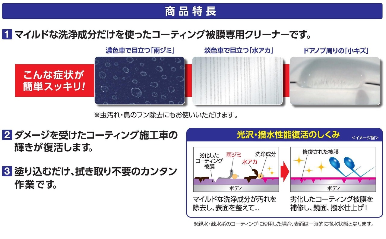 マイルドな洗浄成分だけを使ったコーティング被膜専用クリーナーです。