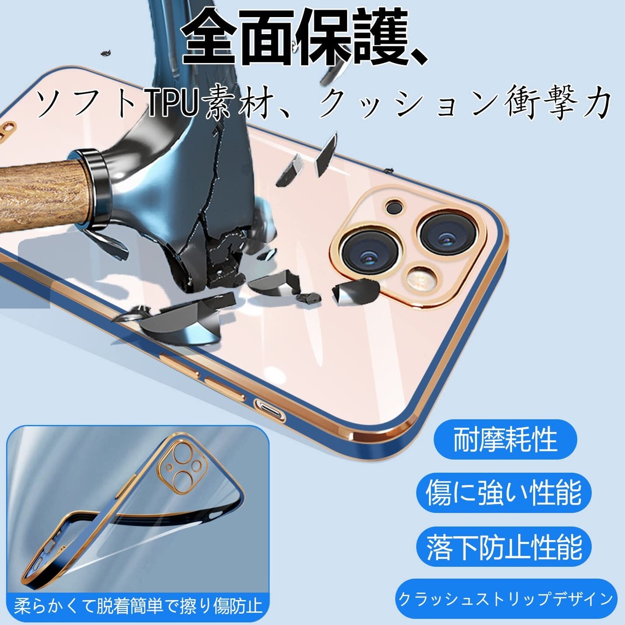 iPhone13 ケース クリア 透明 アイフォン13 カバー スマホケース 全面保護 耐衝撃 TPU ソフト 薄型 メッキ加工 ストラップホール付き 落下防止(ブルー)