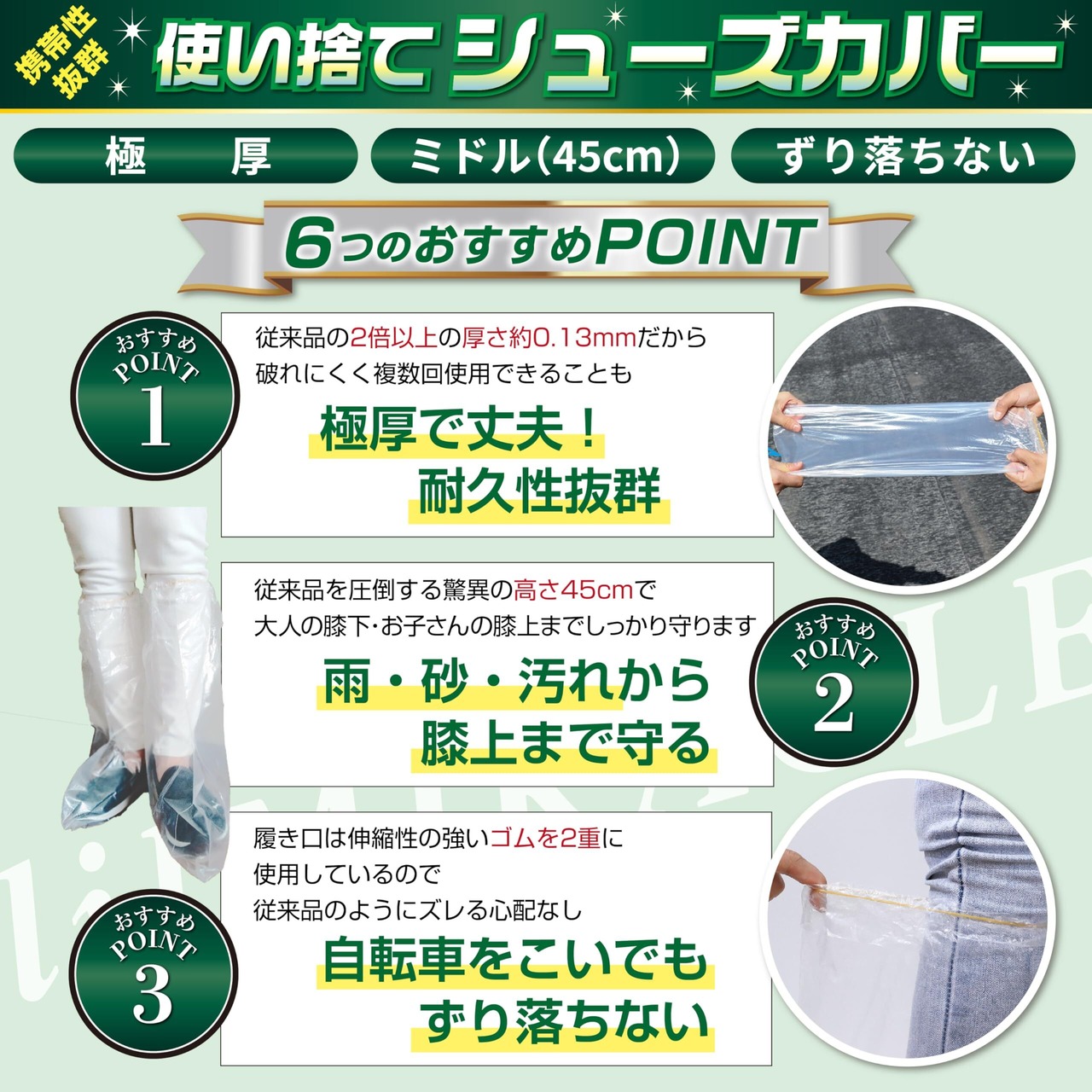 【性能】従来品の2倍以上の極厚0.13㎜で使い捨てでも破れにくく、複数回使うことも可能。高さは膝上を余裕でカバーする超長65㎝でカッパや傘では守れない大切な靴やズボンの裾を余裕で守れるので、お気に入りの靴やズボンを雨の日でも安心して着用できます。履き口のゴムは2重で自転車をこいでもずり落ちないので、自転車でのカッパと相性は抜群です!会社や学校についた時にもズボンはさらさらで快適です。底面はザラザラとしたエンボス加工を採用しているので、従来品に比べ滑りにくくなっています。使い終わったらそのままゴミ箱へ捨てるだけ。※マンホールやつるつるした滑りやすい路面・凍結した場所・雪のある場所・油分がある場所でのご使用はしないでくだい。本製品は素材の性質上路面と靴の摩擦による損傷で底面から多少の水がしみ込んでくることがございます。