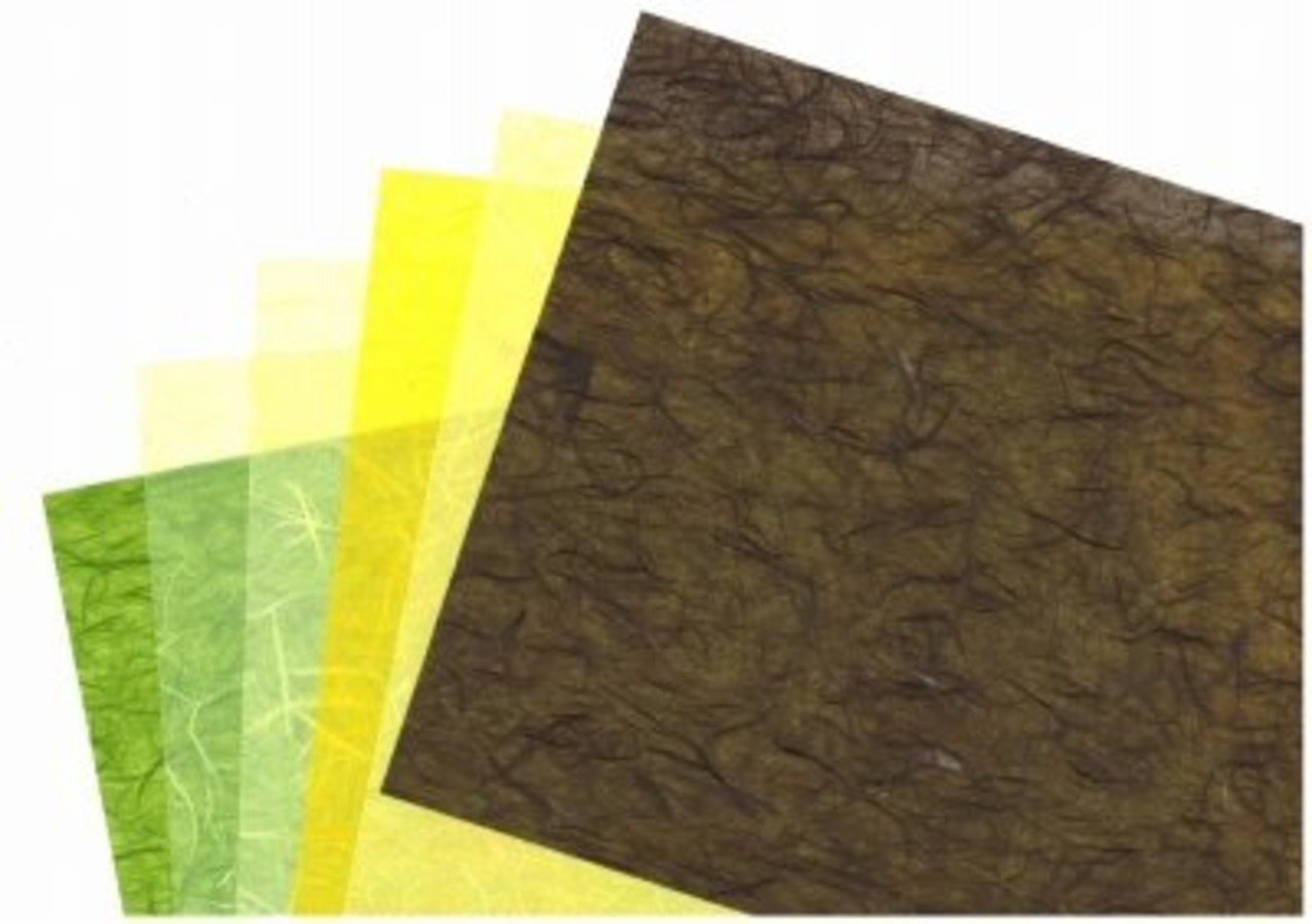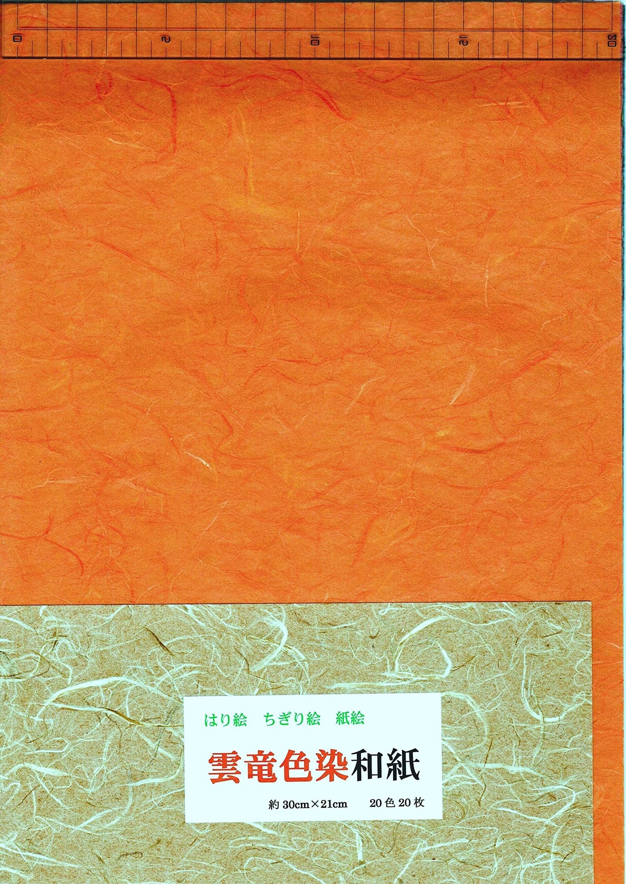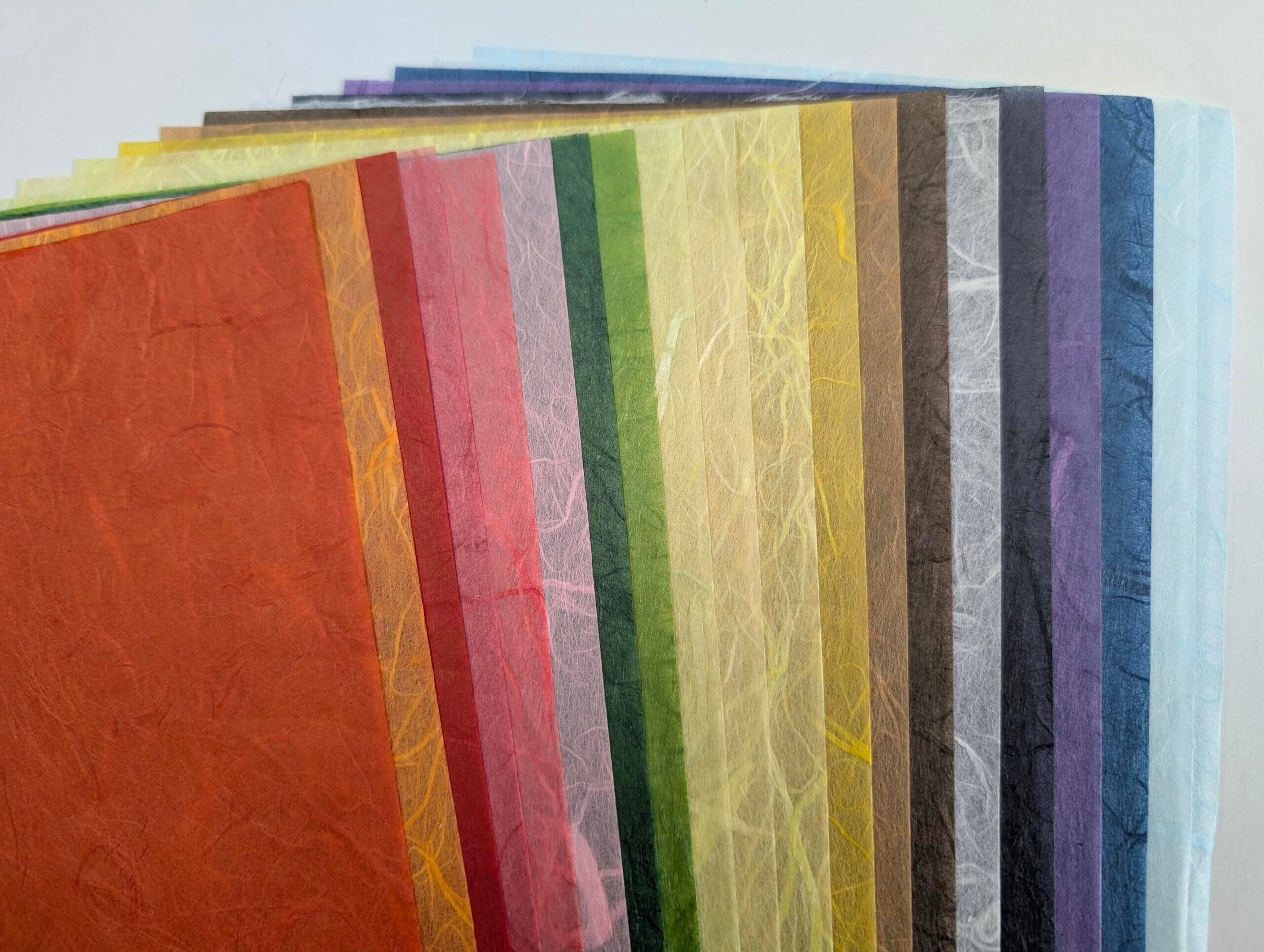 和紙の寸法は、約30cm×21cm 20色20枚入りのセットです。 純楮で機械漉き。 着色した楮の繊維を混ぜて漉いたものです。 長い繊維が様々の方向にくねるようになり、装飾となります。 それぞれの厚さは、約3.5匁(13g強) ティッシュペーパー一枚より若干厚目程度です。