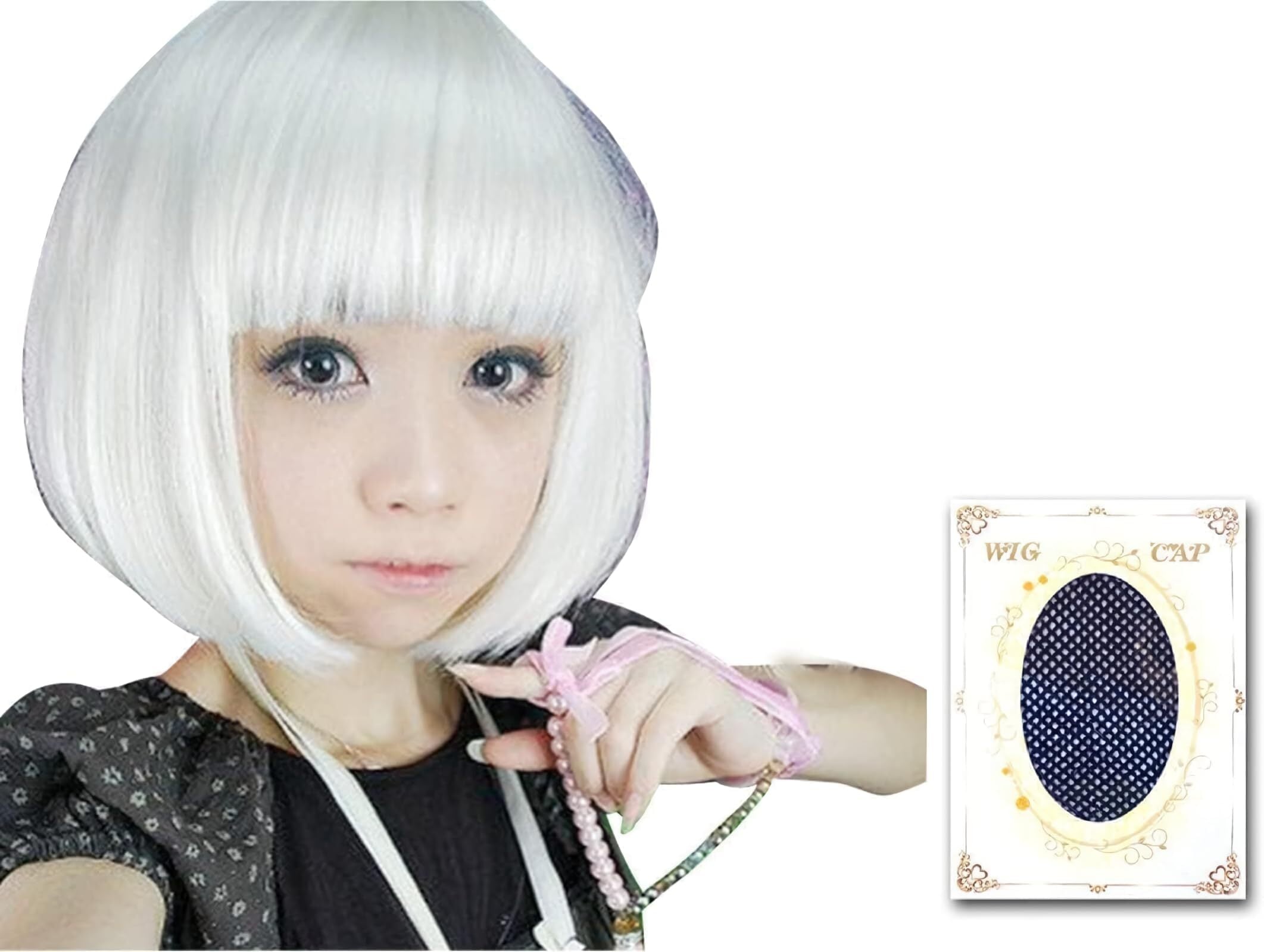 happykoko ボブ ウィッグ 白 自然 ぱっつん 原宿系 ウイッグ ミディアム ショート フルウィッグ 耐熱 人工頭皮 ネット付き 白色