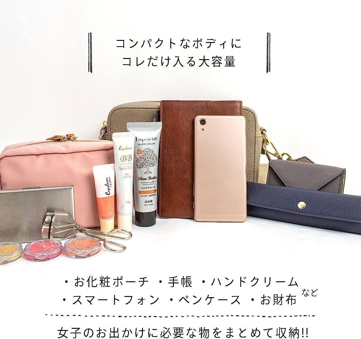 [スペック]・メイン収納×2 ・インナーポケット×1 ・細ストラップ×1 ・幅広ベルト×1 [サイズ]・縦 150mm × 横 220mm × 厚み 95mm ・重さ 330g [素材]PUレザー