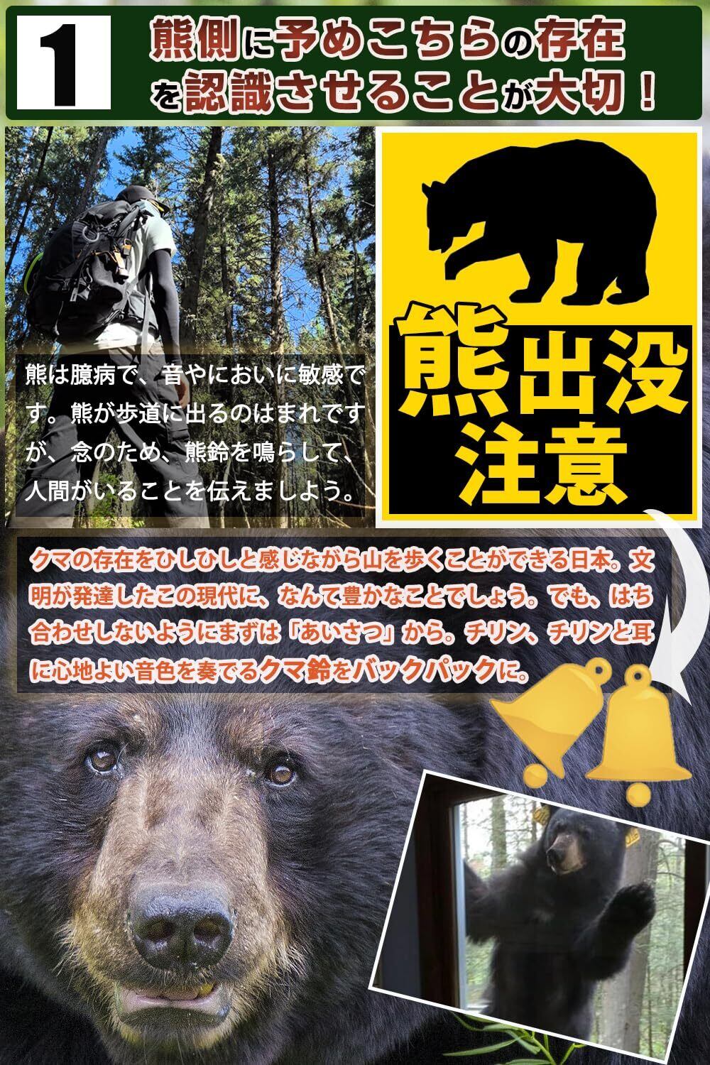 【熊よけベル】熊よけ鈴を鳴らしながら移動して、熊側に予めこちらの存在を認識させることが大切だとされています熊の恐怖から逃れるならばシンプルなものです。この熊鈴、ベルは結構効果的!小さいながら音は大きい。試しに鳴らしてみると、離れていても音がしっかり聞こえます。