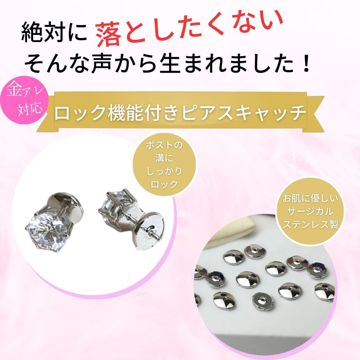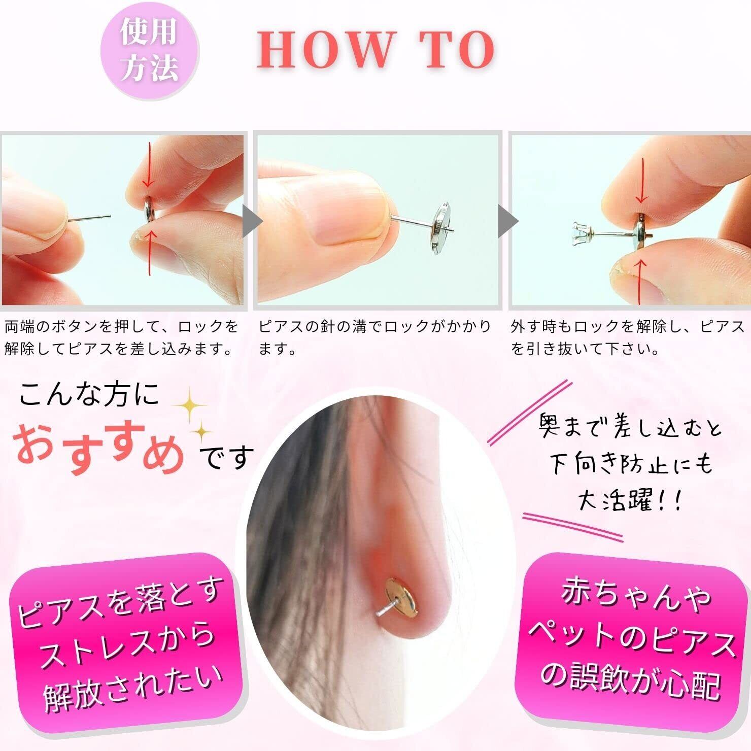 【もうピアスは落とさない!】ロック機能付きのピアスキャッチで大切なピアスを失くすストレスを解消します。また、奥まで差し込むことでピアスの下向き防止にも大活躍のおススメのキャッチです。