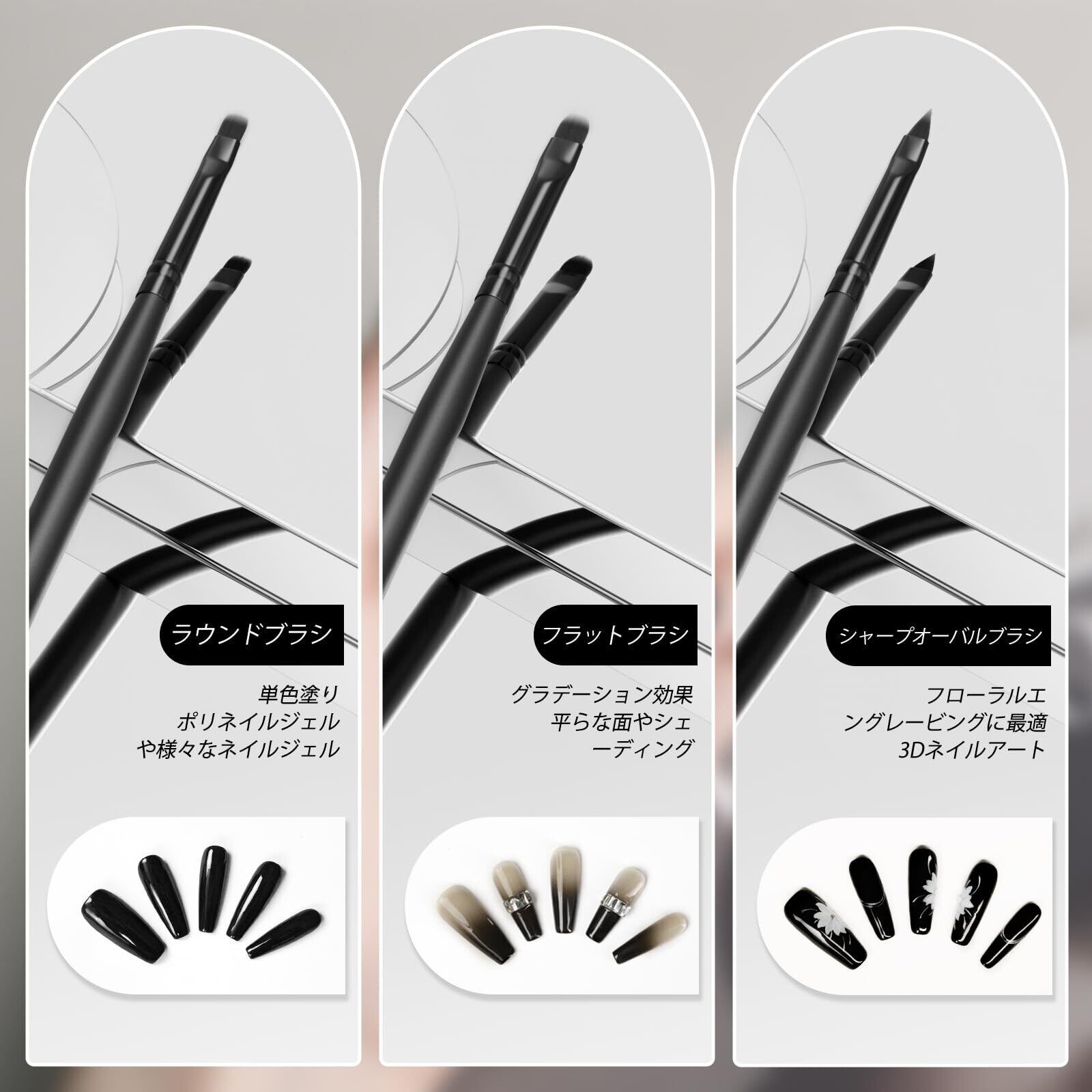 【多用途のセット】この8点セットには、スクエア、ラウンド、フランス、シャープオーバル、フラット、そして3本の極細&ドットペンが含まれており、多様なネイルアートのニーズに対応できます。各ブラシはネイリストもよく使用する定番のものを揃えており、基本の8種類が揃っているため、これ一つで幅広いデザインが楽しめます。プロフェッショナルから初心者まで、すべてのユーザーにお勧めのセットです。