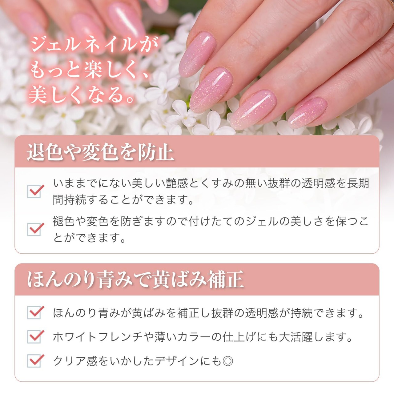 曇りもないからアートやカラーが映えるクリア感に仕上がり満足度MAX 美しい艶はもちろんトップジェル塗りたてのクリア感が長期間持続します!
